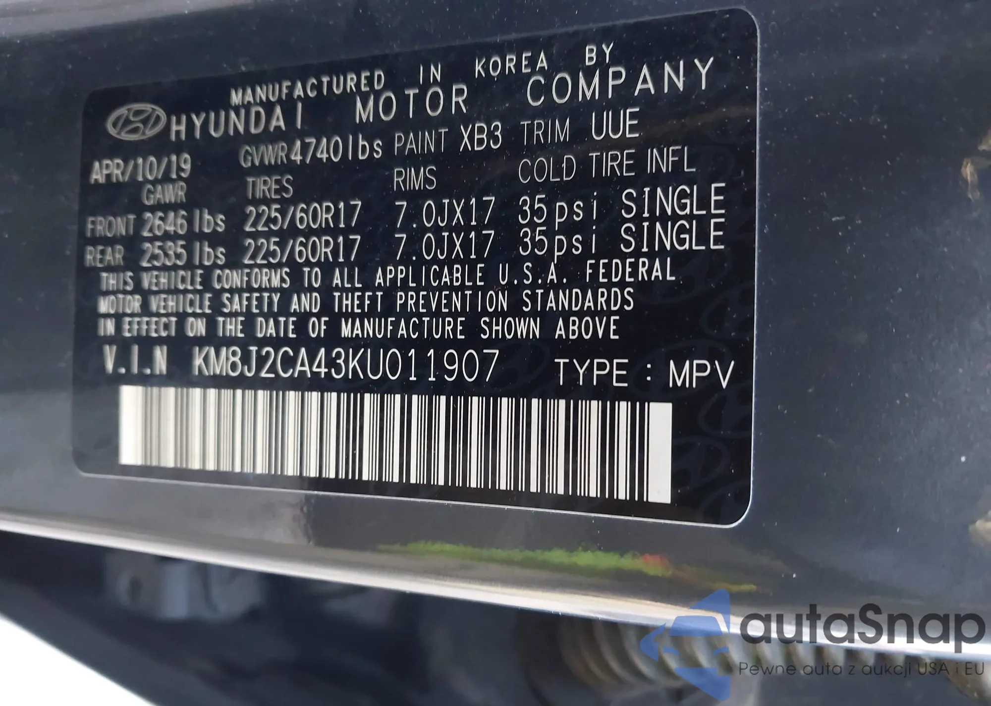 • VIN KM8J2CA43KU011907