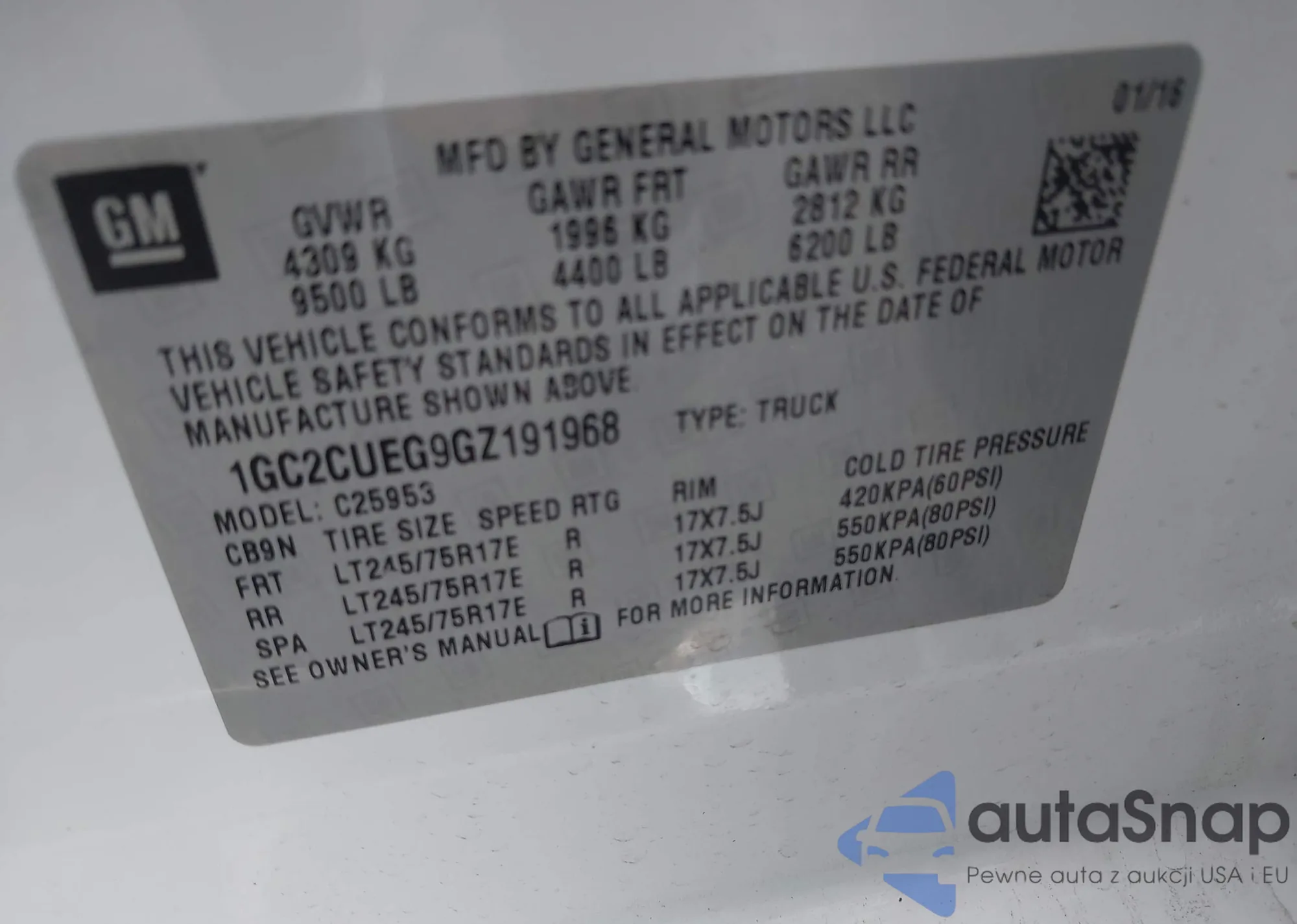 LOT: 42736965 VIN: 1GC2CUEG9GZ191968