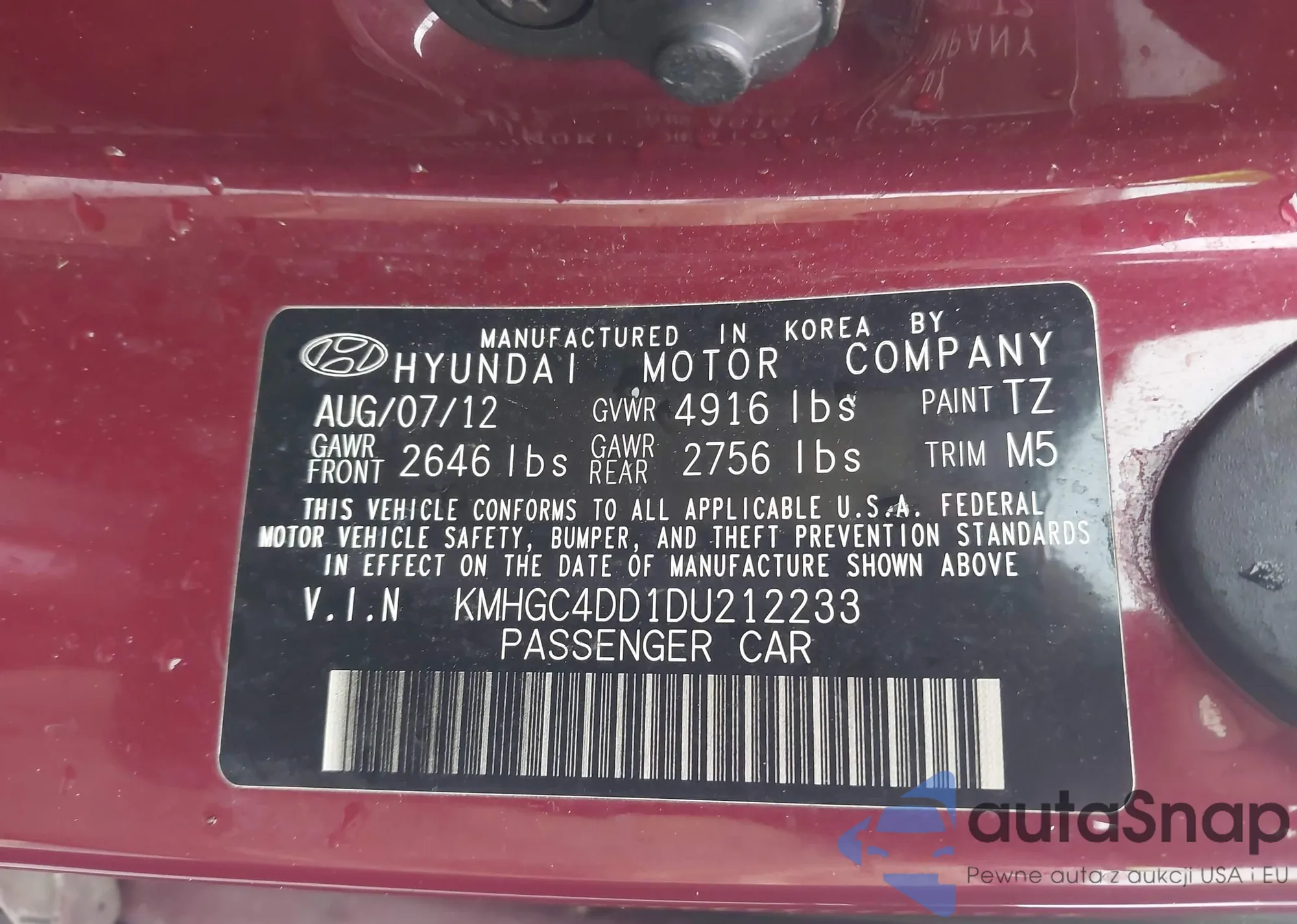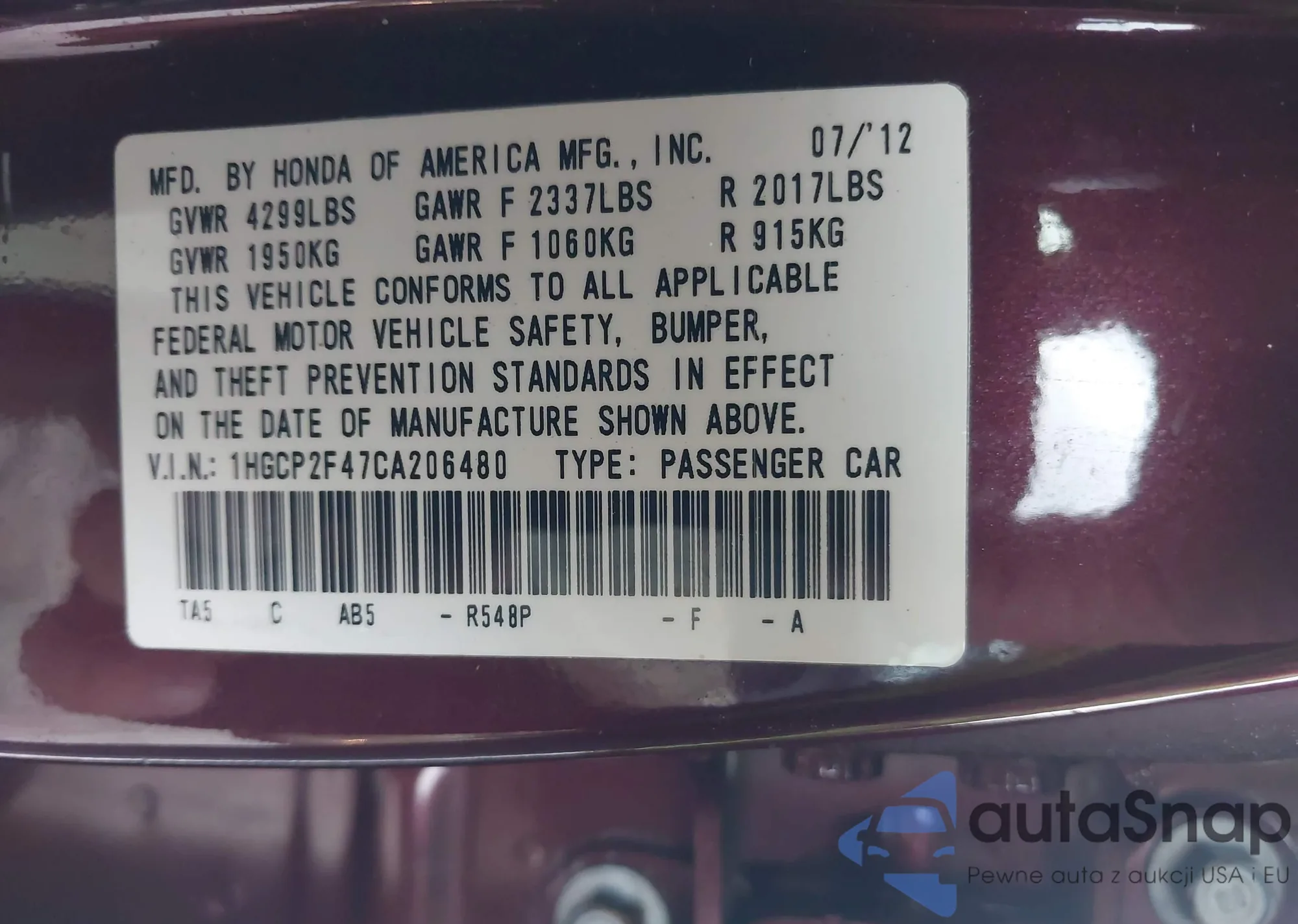 LOT: 43515065 VIN: 1HGCP2F47CA206480