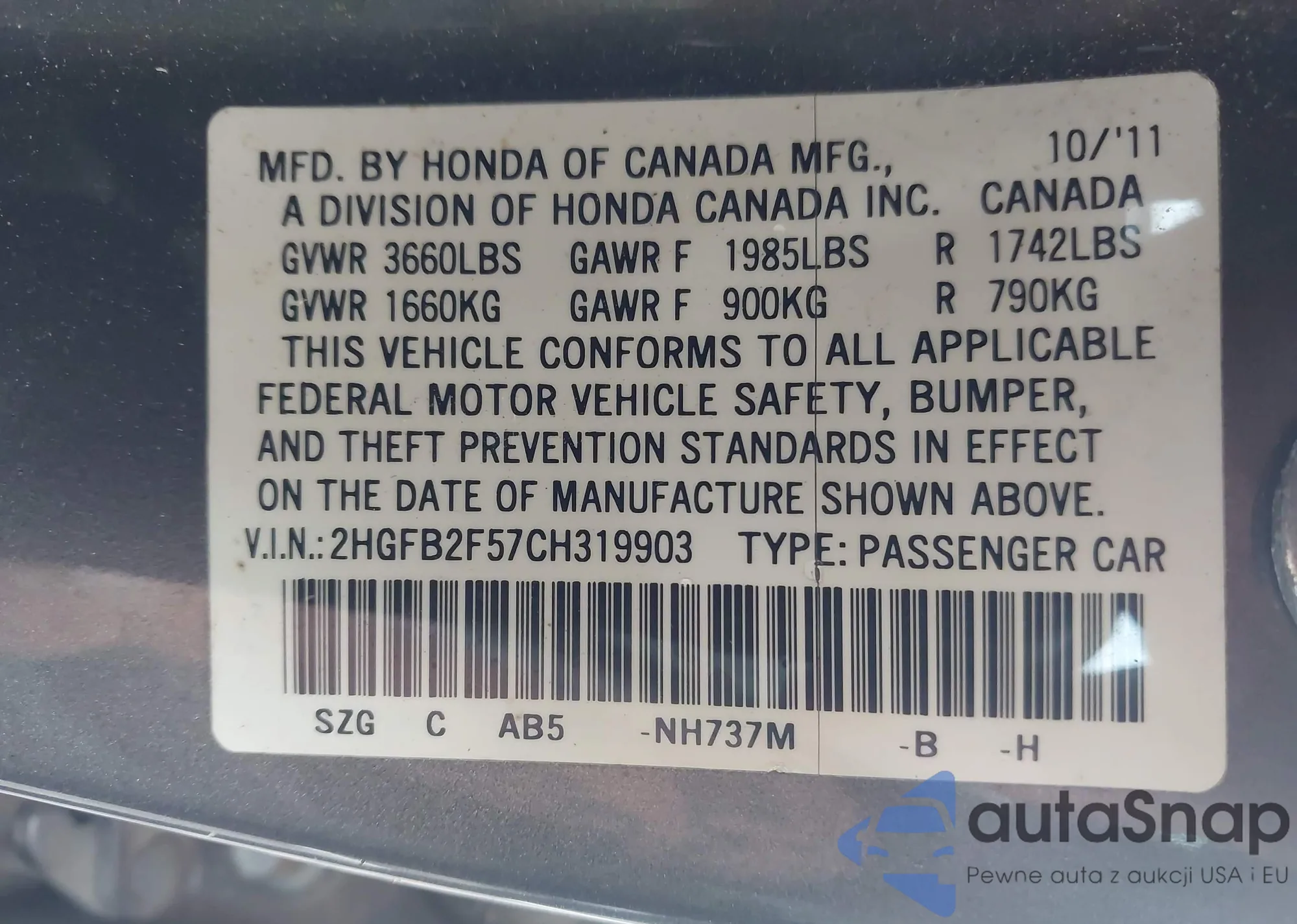 • VIN 2HGFB2F57CH319903