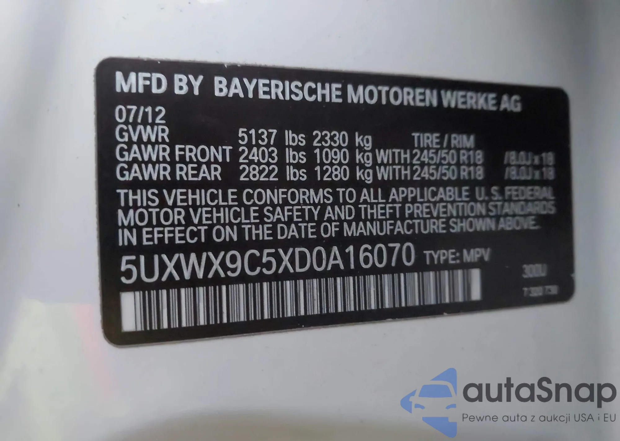 • VIN 5UXWX9C5XD0A16070