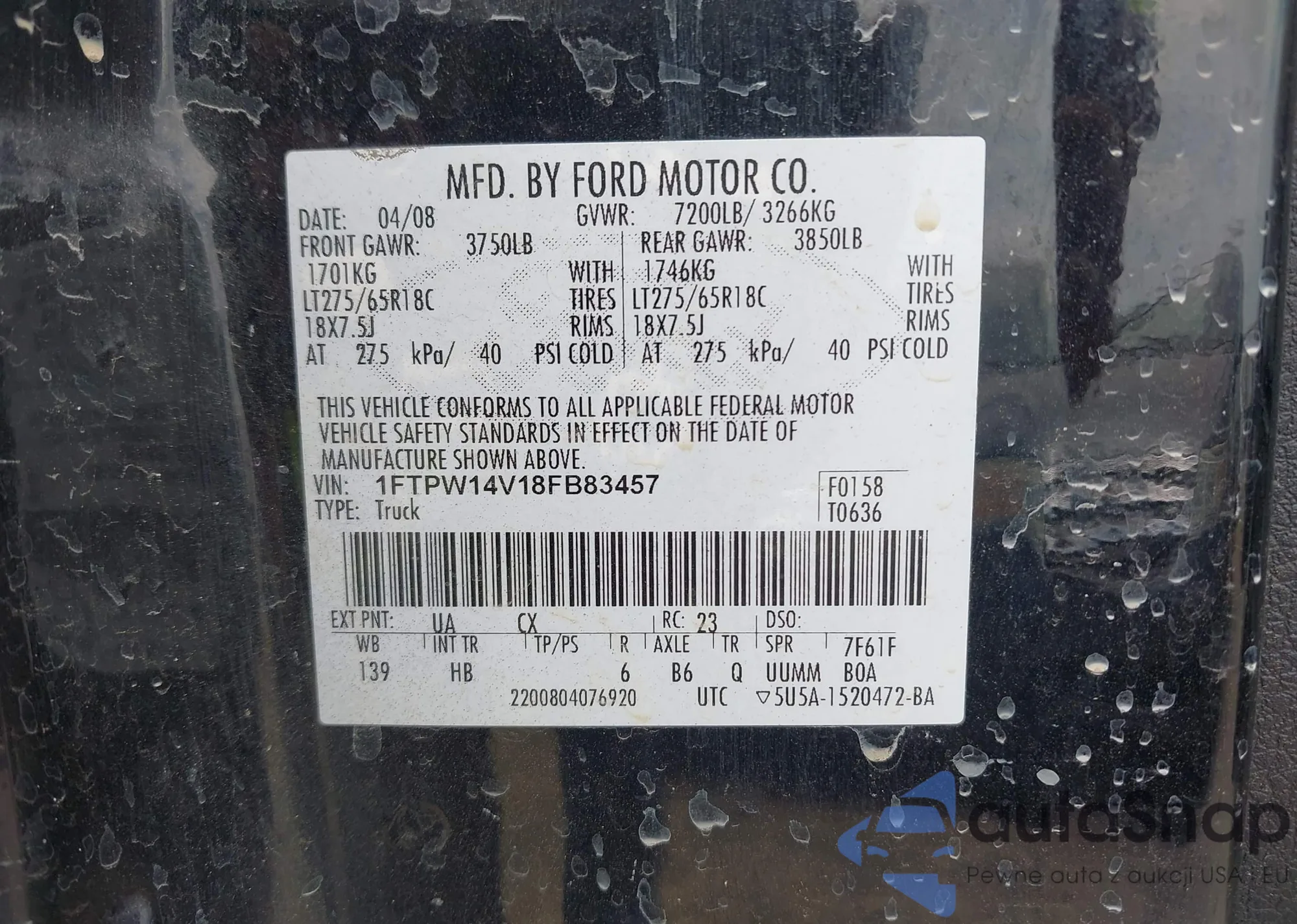 LOT: 42885917 VIN: 1FTPW14V18FB83457