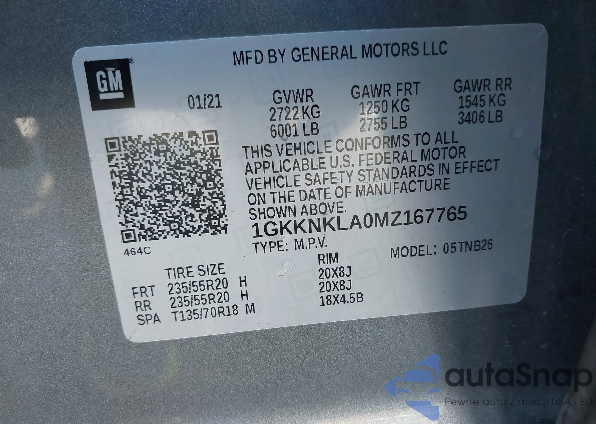 LOT: 42899392 VIN: 1GKKNKLA0MZ167765