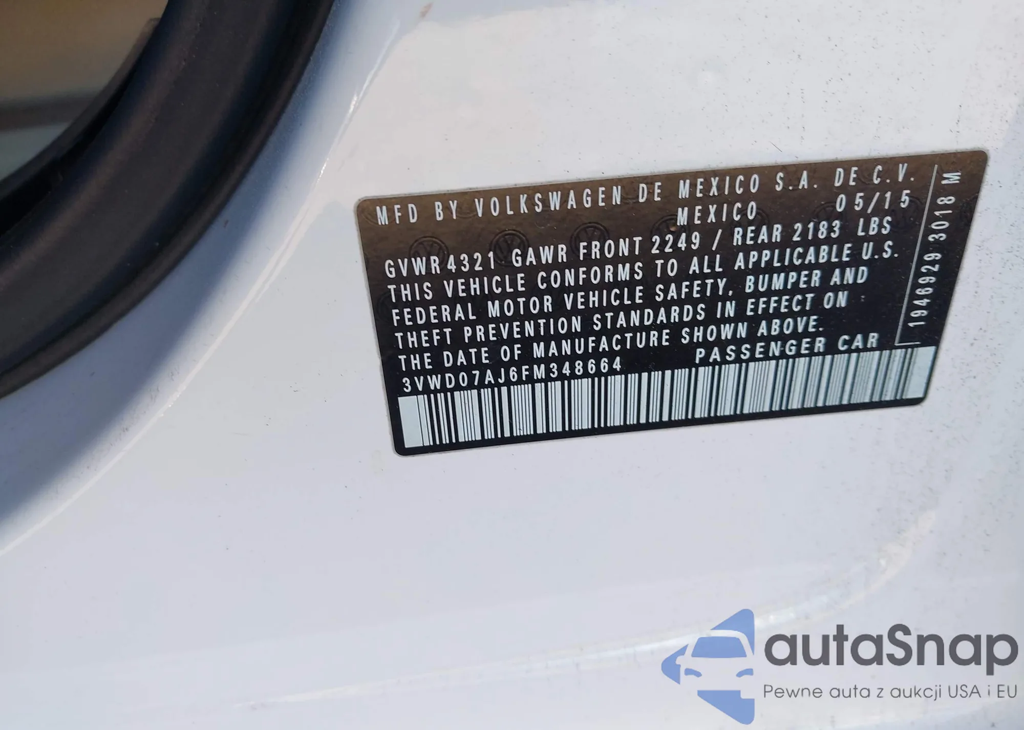• VIN 3VWD07AJ6FM348664