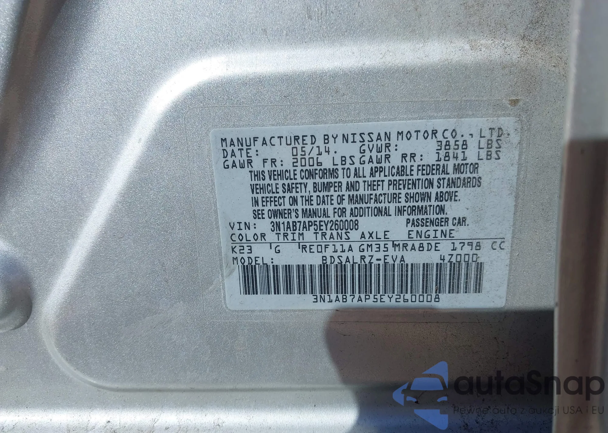 LOT: 43476392 VIN: 3N1AB7AP5EY260008