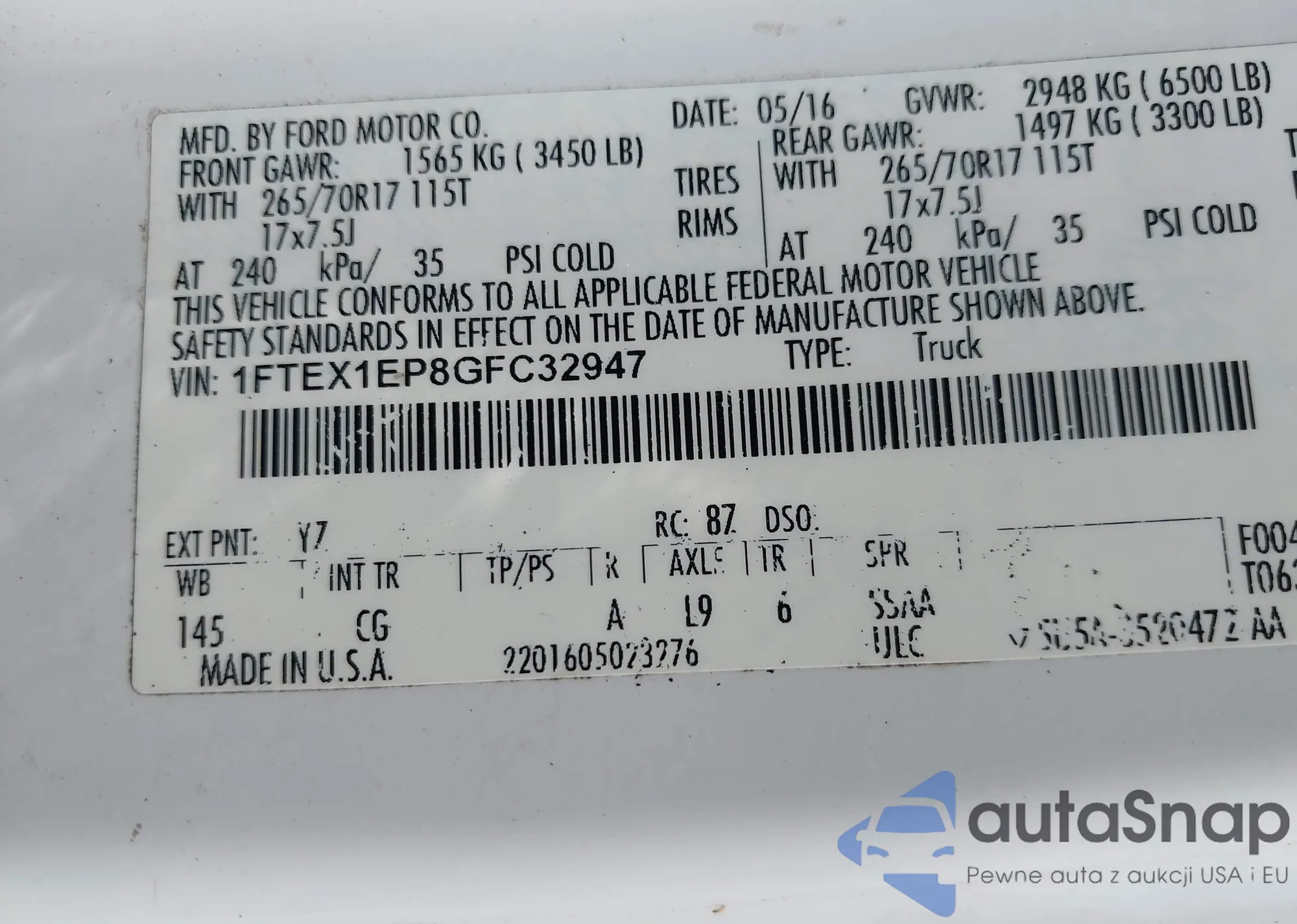 LOT: 42117492 VIN: 1FTEX1EP8GFC32947