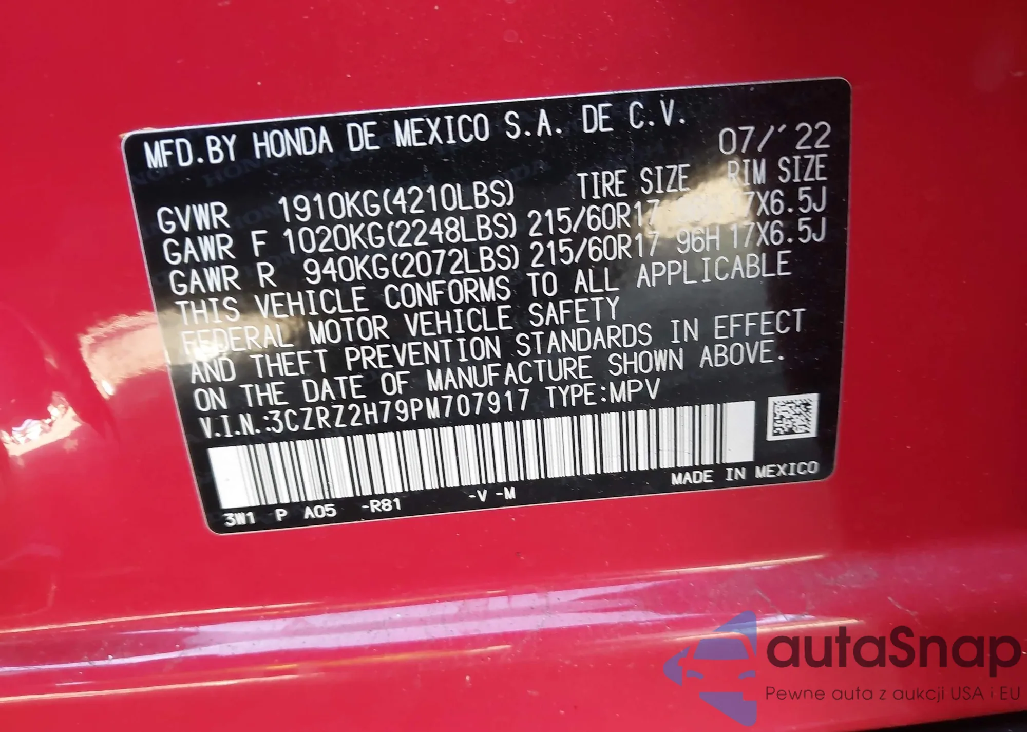 • VIN 3CZRZ2H79PM707917