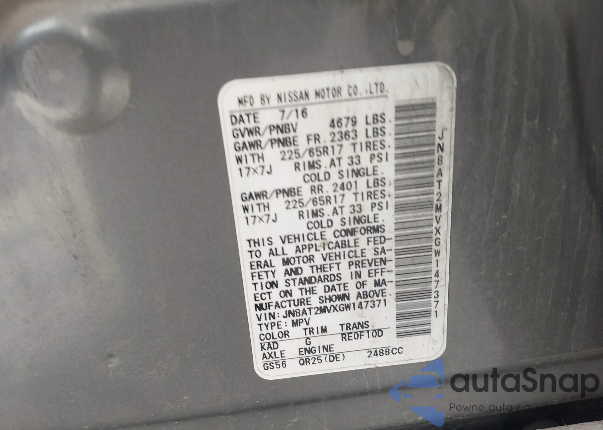 LOT: 43377165 VIN: JN8AT2MVXGW147371