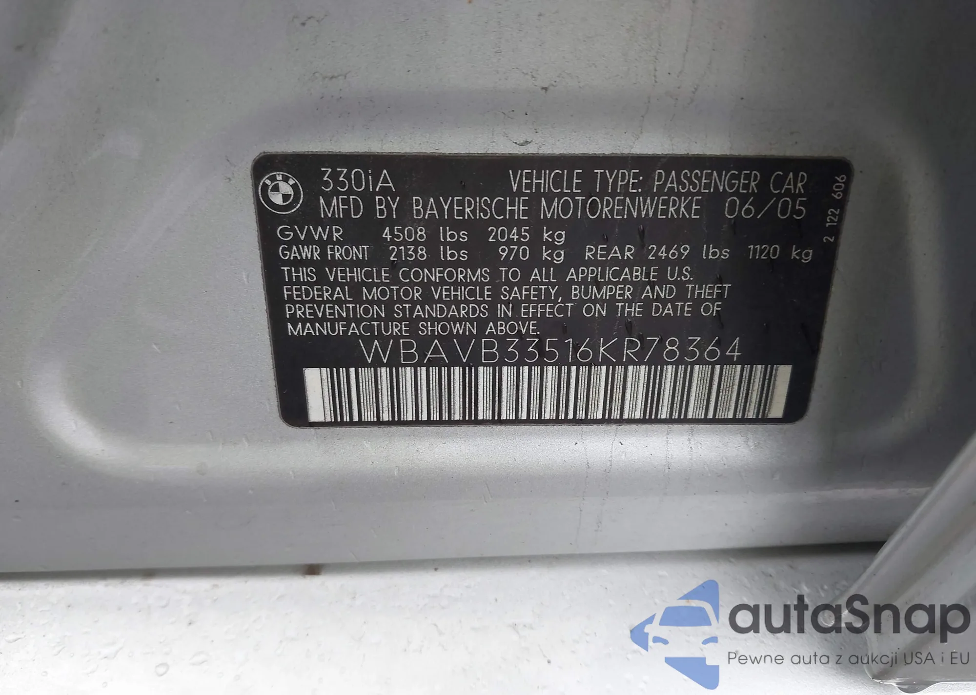 2006 BMW 330I из США, поврежденный, VIN WBAVB33516KR78364