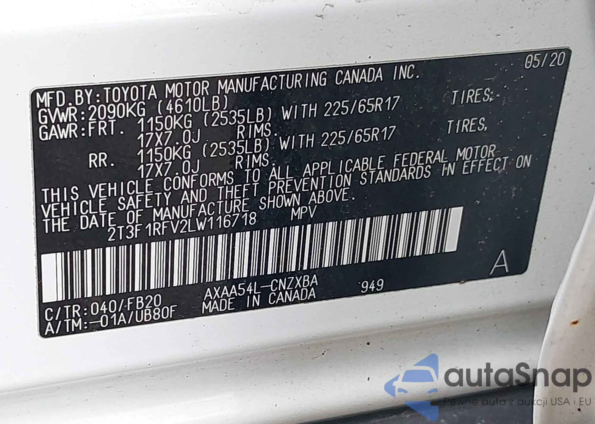 LOT: 43428661 VIN: 2T3F1RFV2LW116718