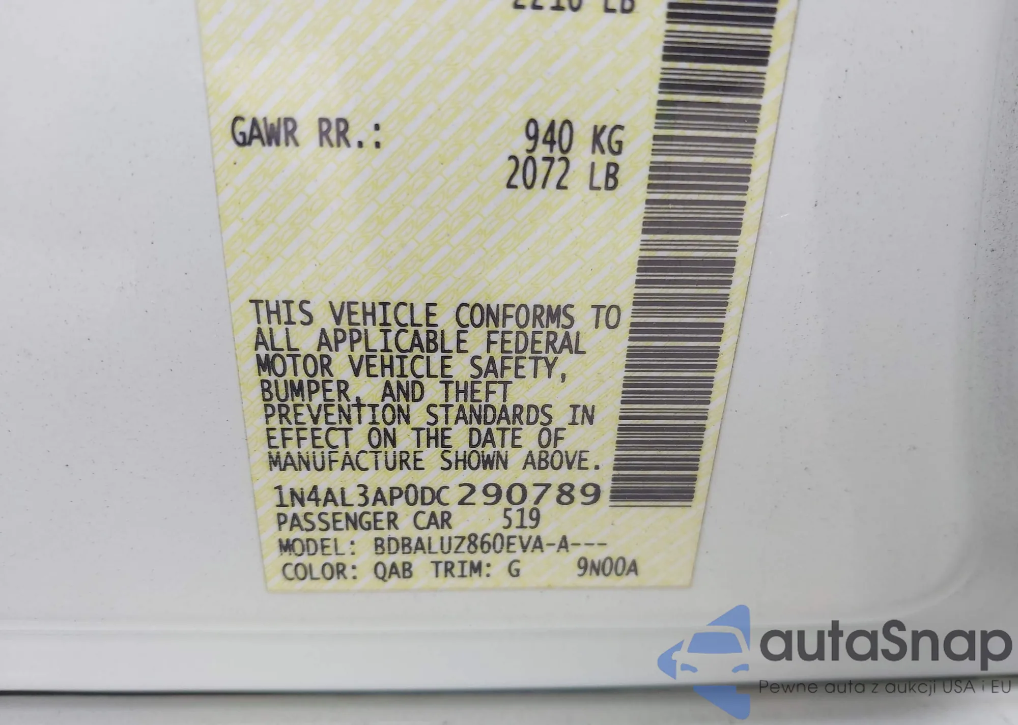 • VIN 1N4AL3AP0DC290789