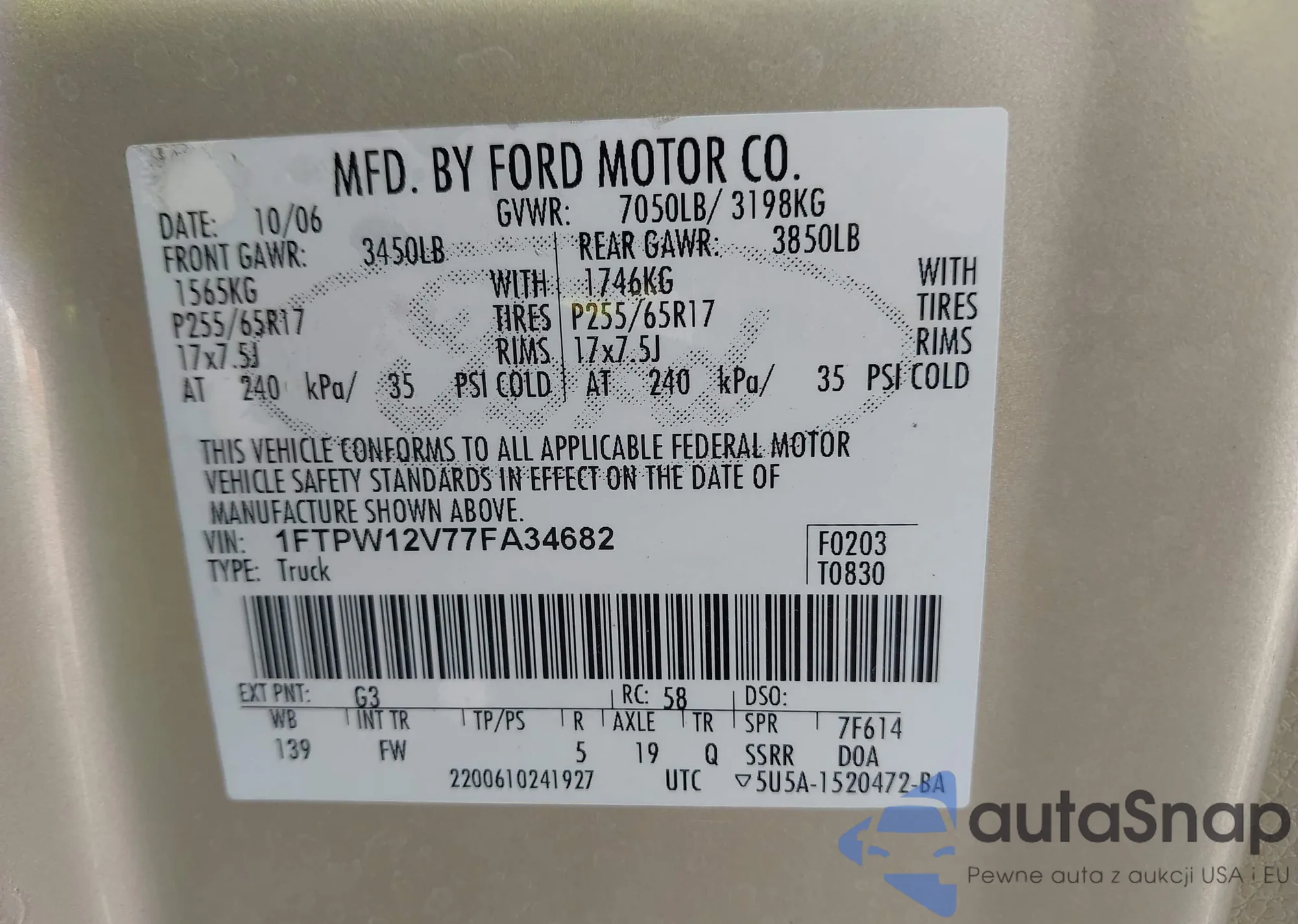 LOT: 43692824 VIN: 1ZVFT82H775292081