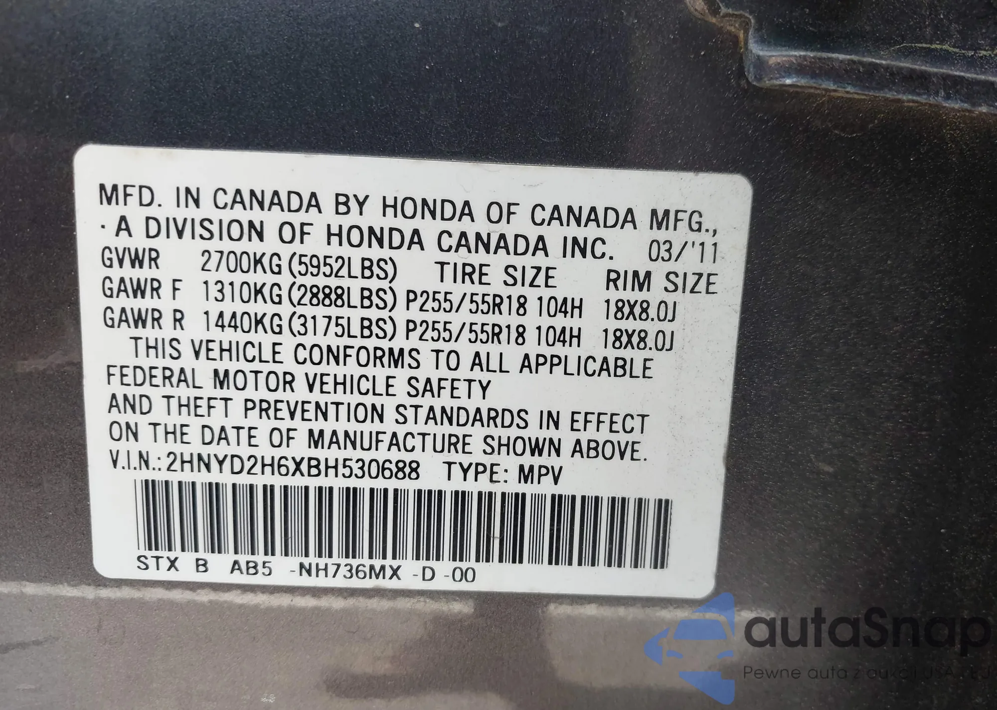 • VIN 2HNYD2H6XBH530688