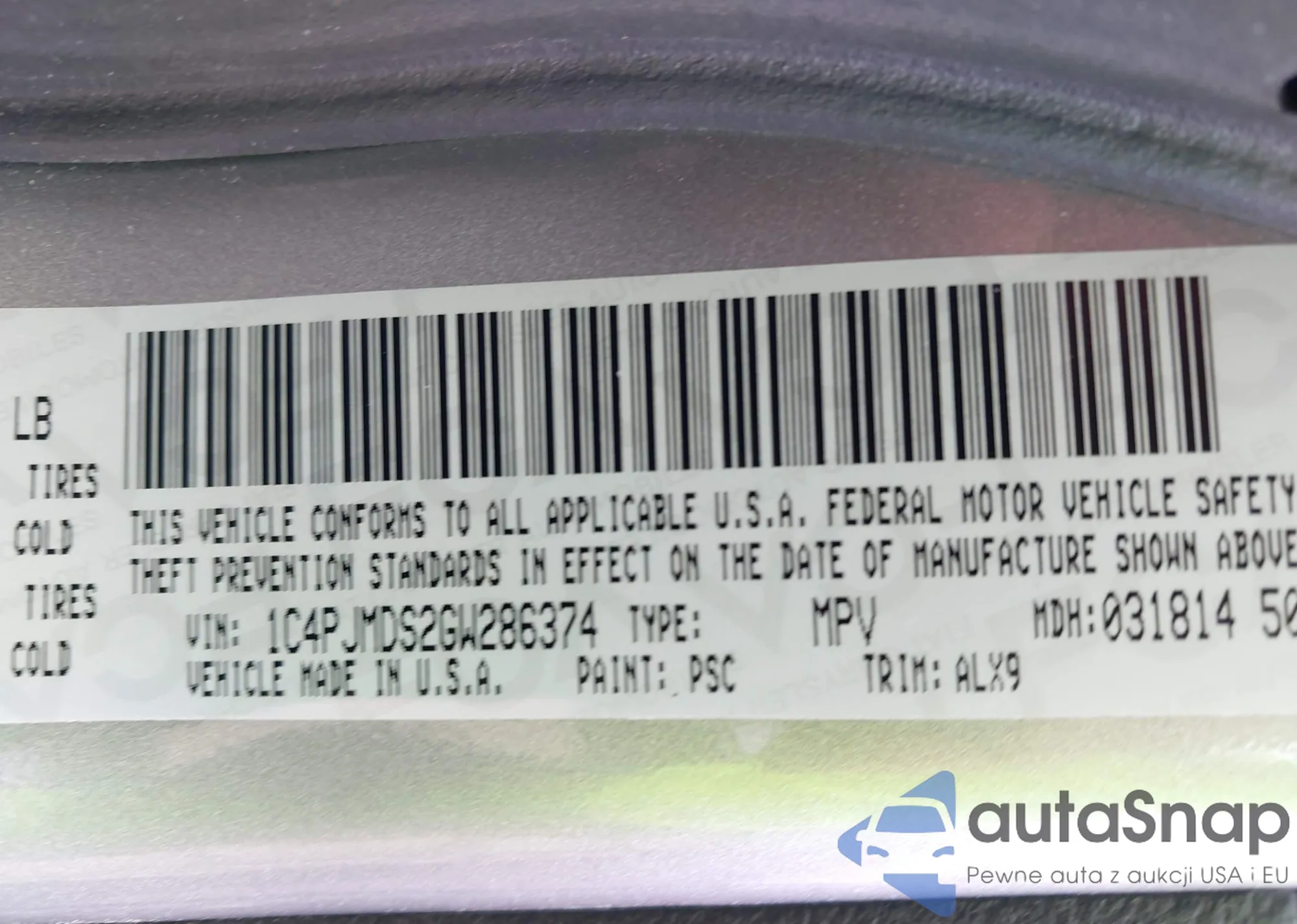 LOT: 43283055 VIN: 1C4PJMDS2GW286374