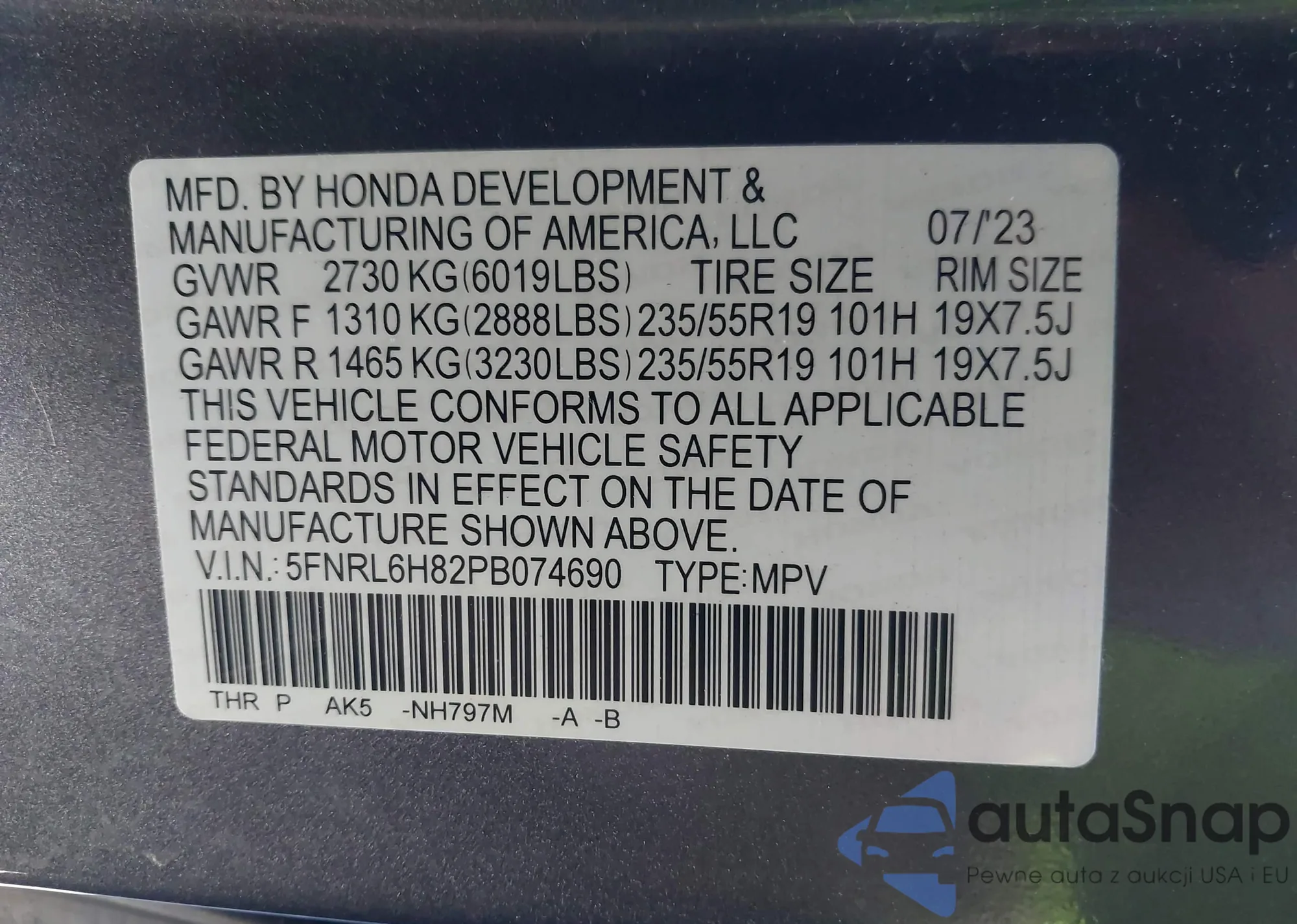 • VIN 5FNRL6H82PB074690