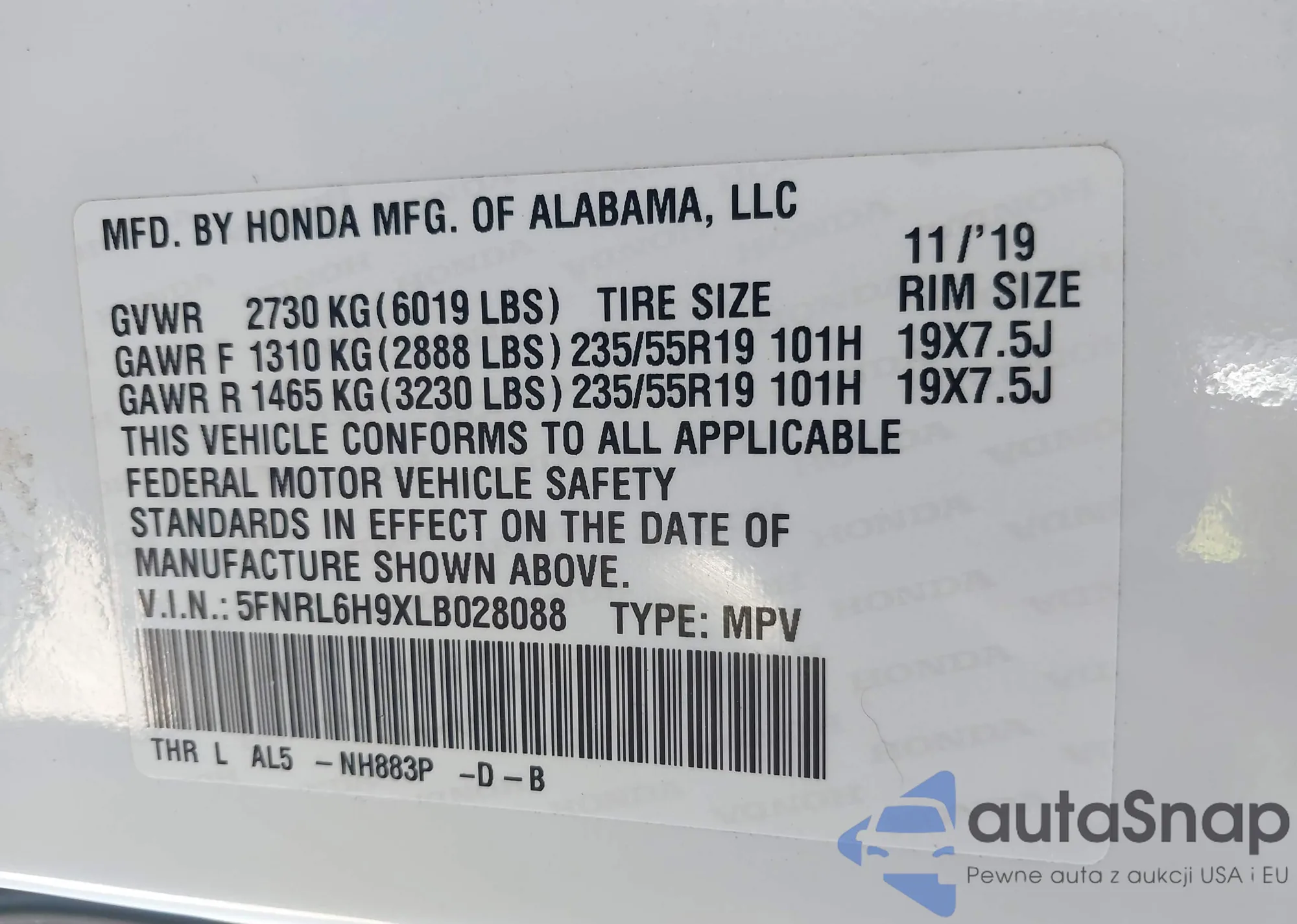 • VIN 5FNRL6H9XLB028088