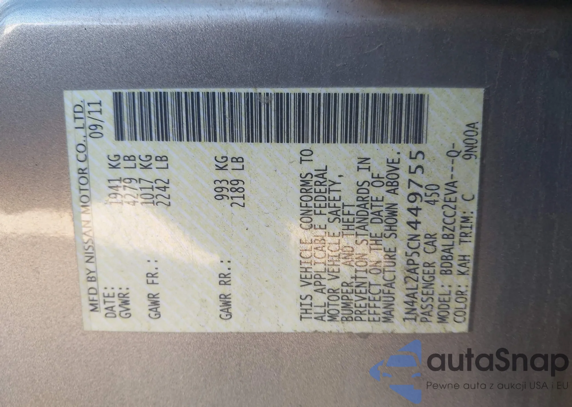 LOT: 43619752 VIN: 1N4AL2AP5CN449755