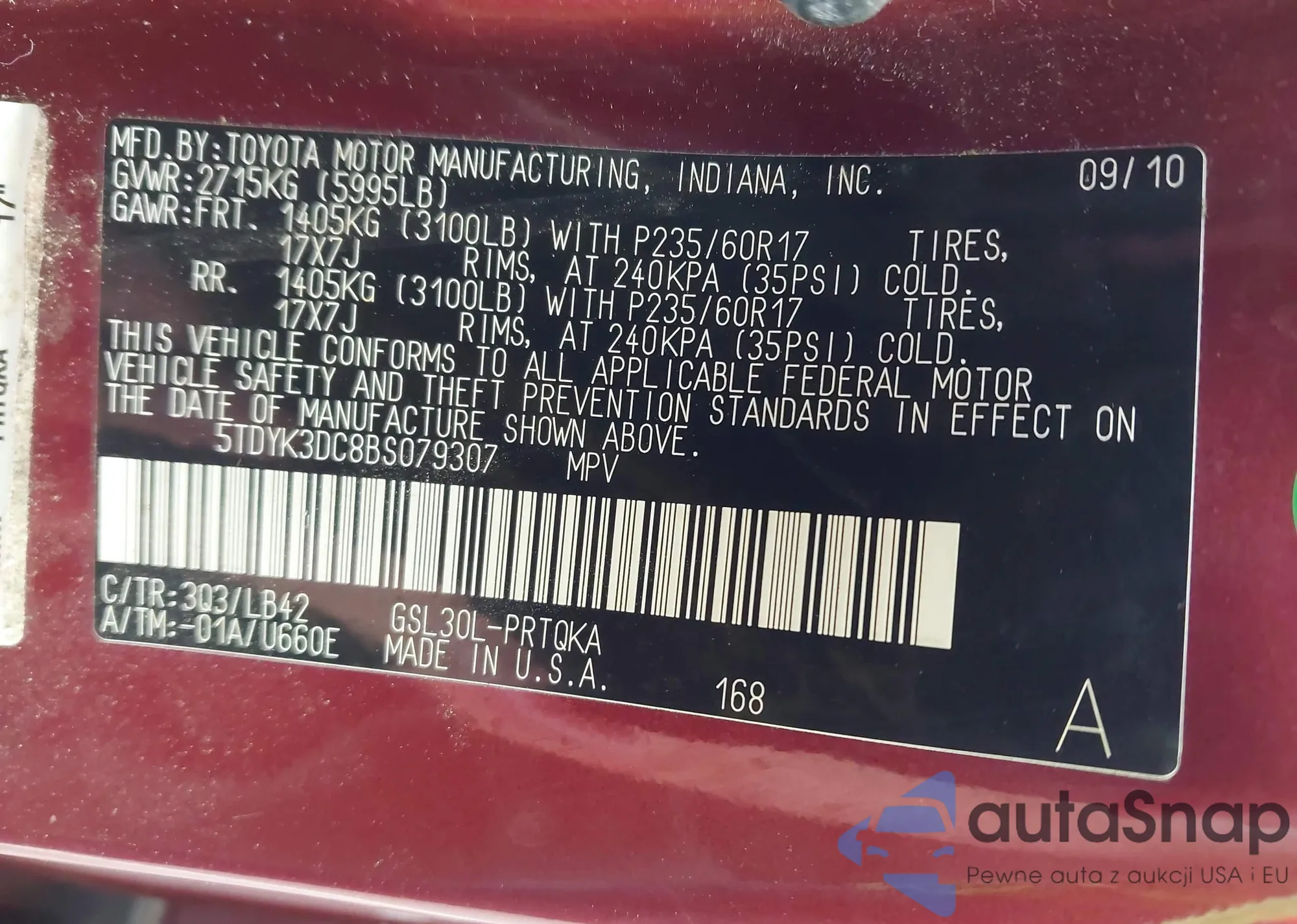 • VIN 5TDYK3DC8BS079307