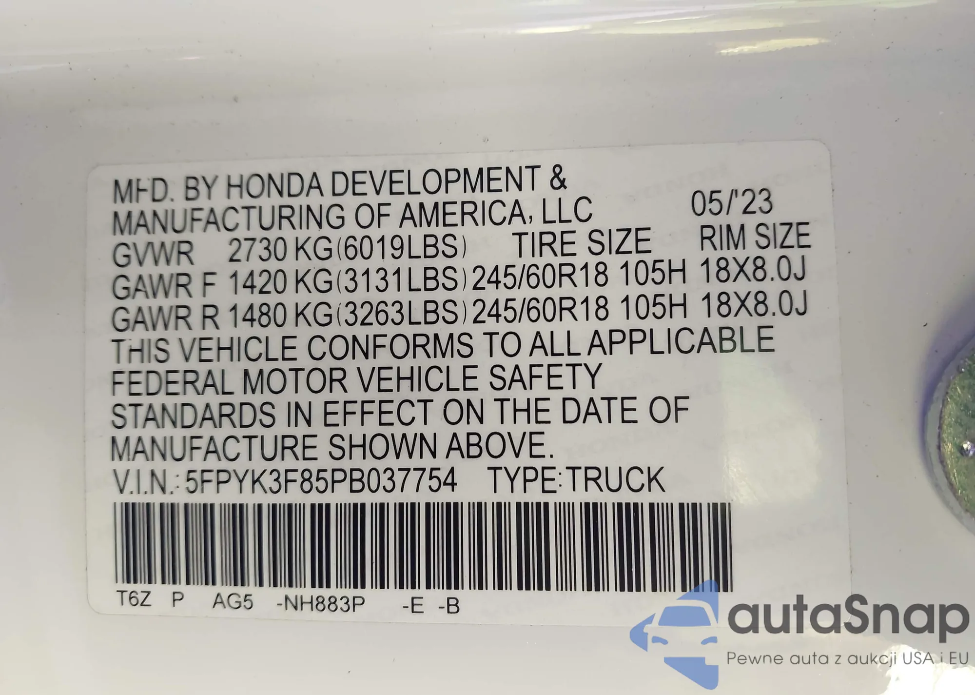 • VIN 5FPYK3F85PB037754