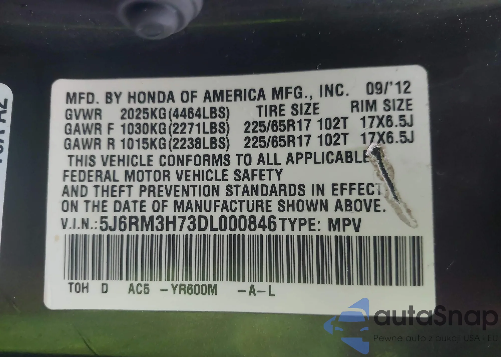 LOT: 43438858 VIN: 5FPYK3F85PB037754