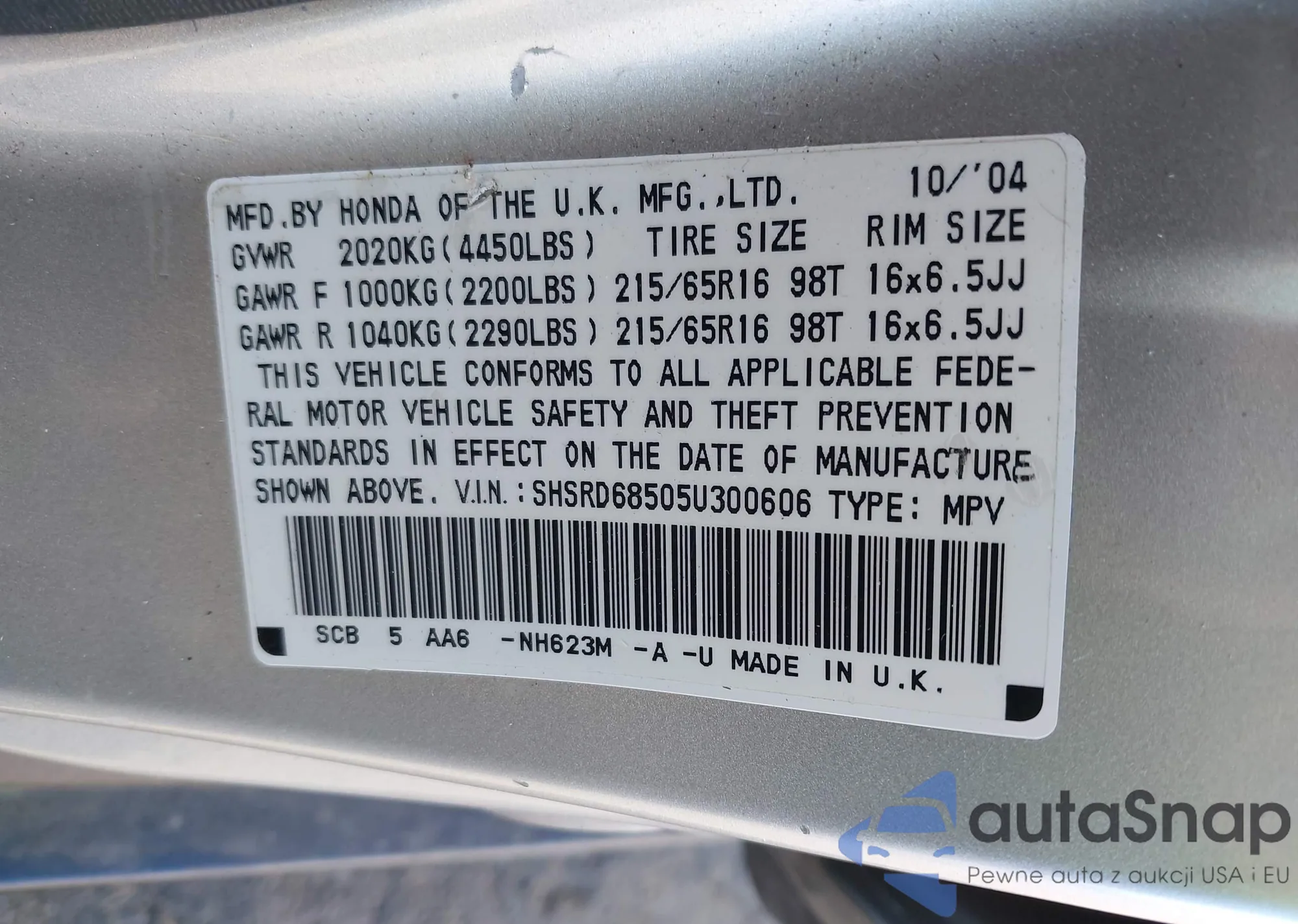 LOT: 43461620 VIN: SHSRD68505U300606
