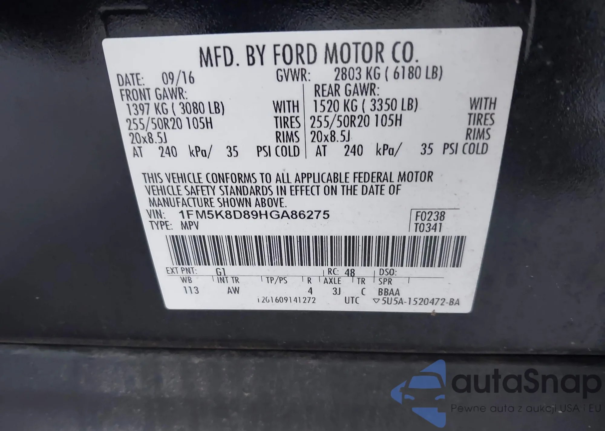 LOT: 43535228 VIN: 1FM5K8D89HGA86275