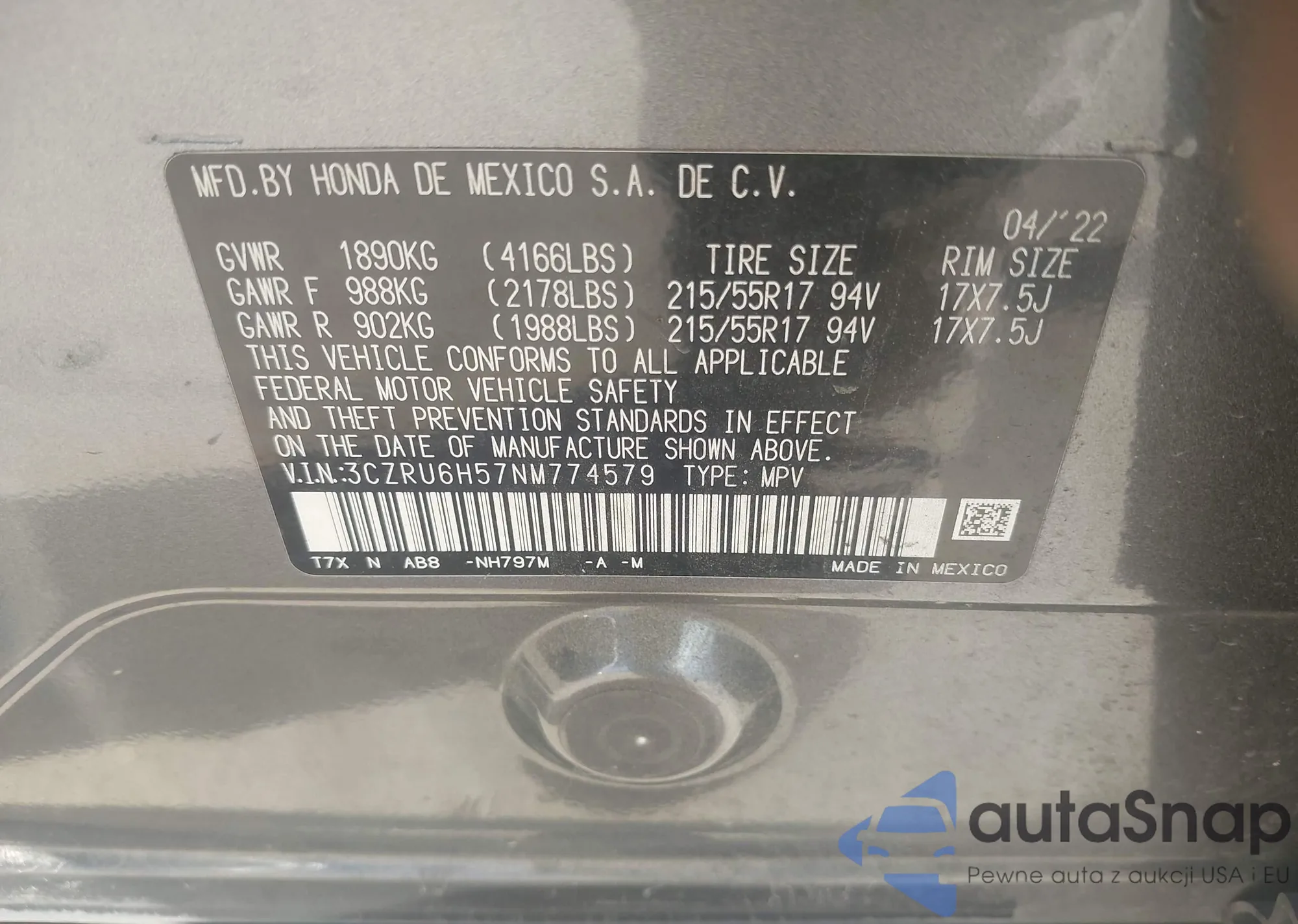 • VIN 3CZRU6H57NM774579
