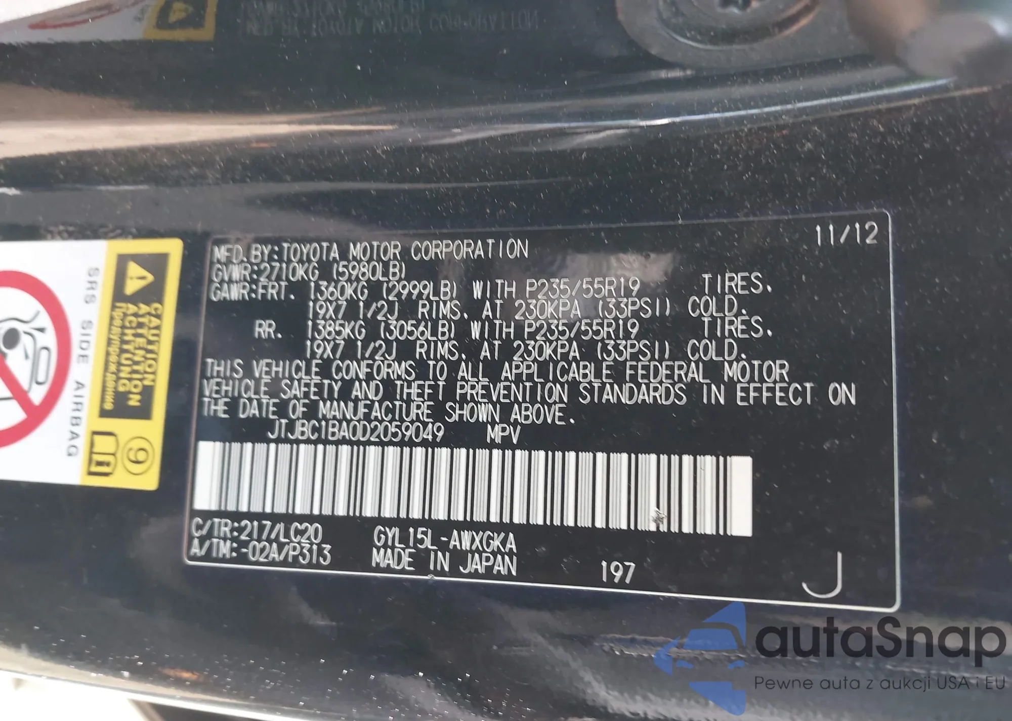 LOT: 43484517 VIN: 4T1BF1FKXCU193868