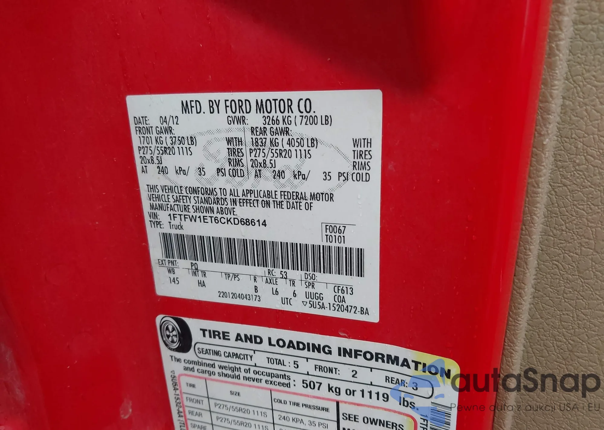 LOT: 43723260 VIN: 1FTFW1ET6CKD68614
