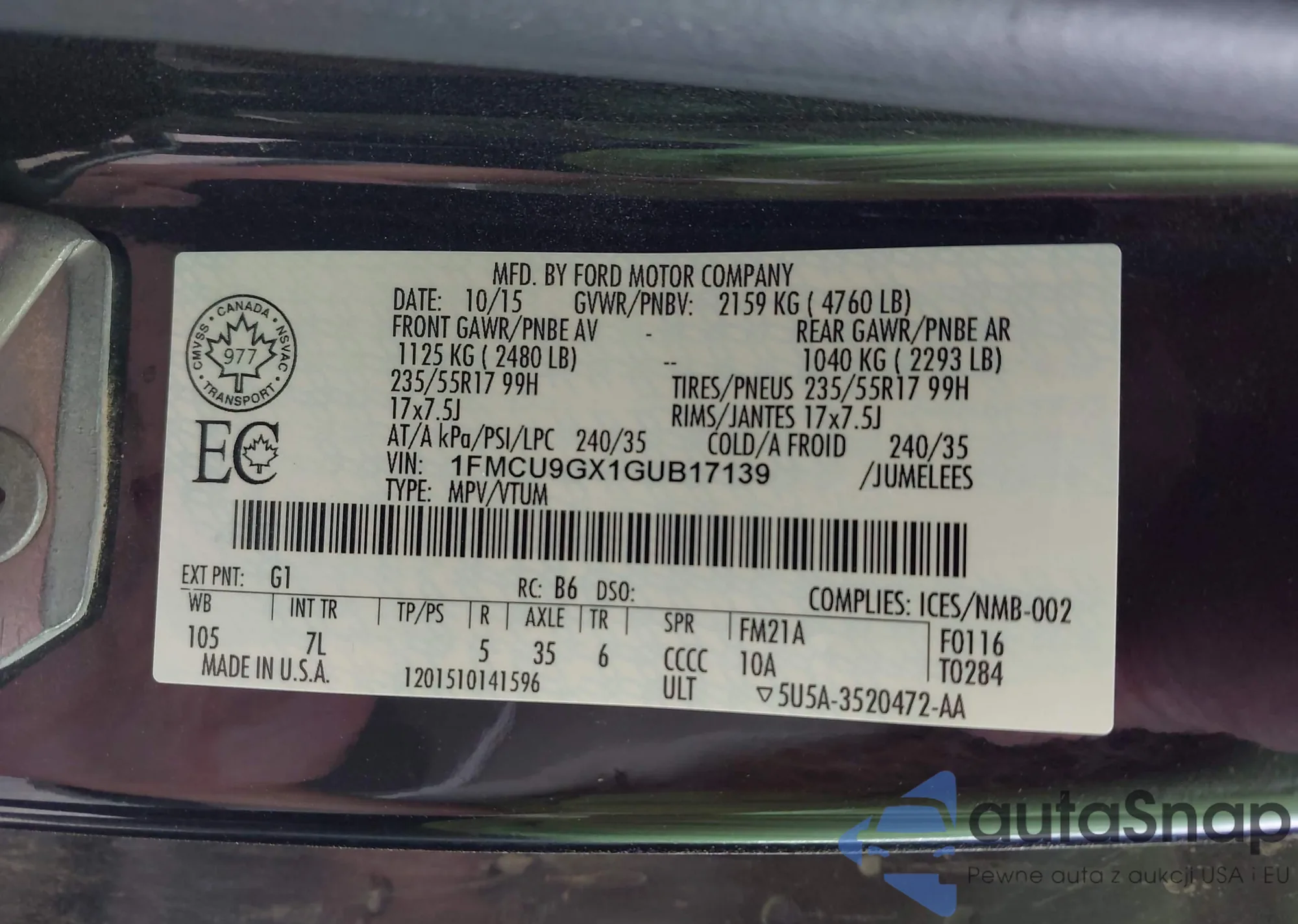 • VIN 1FMCU9GX1GUB17139