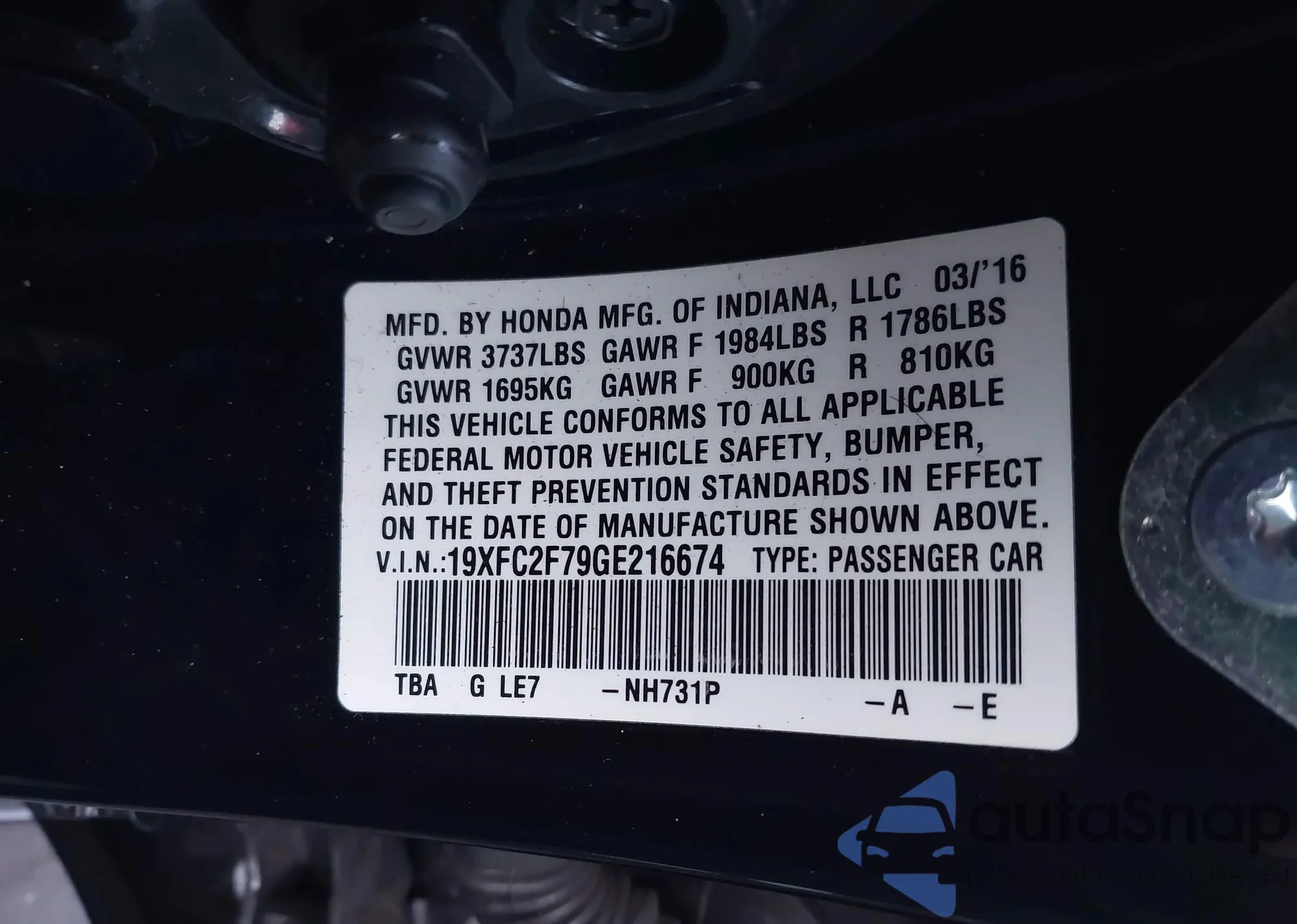 • VIN 19XFC2F79GE216674