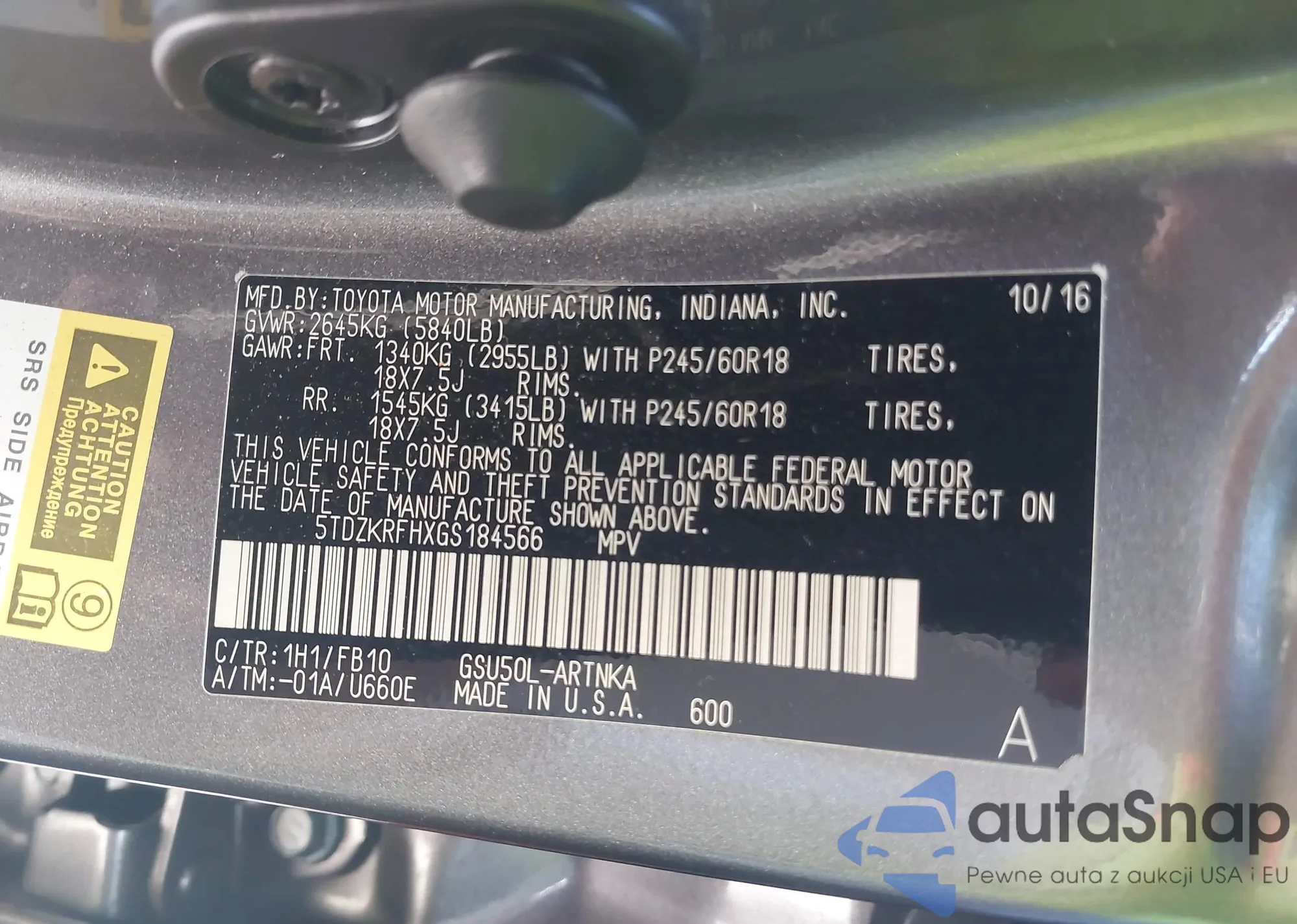 LOT: 43591853 VIN: 5TDZKRFHXGS184566