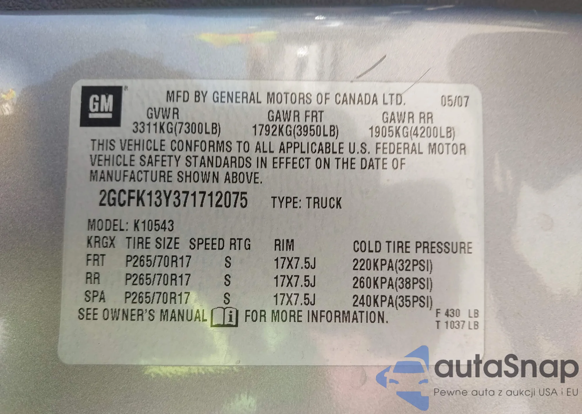 • VIN 2GCFK13Y371712075