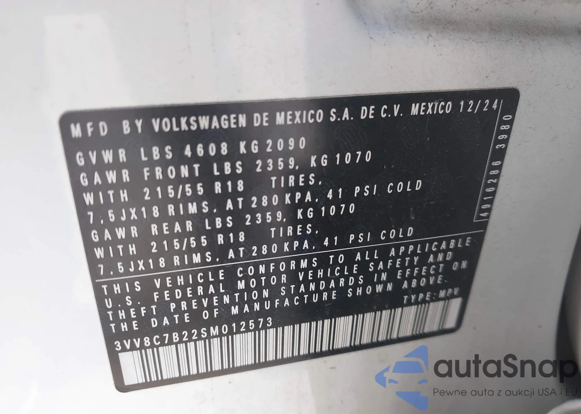 • VIN 3VV8C7B22SM012573