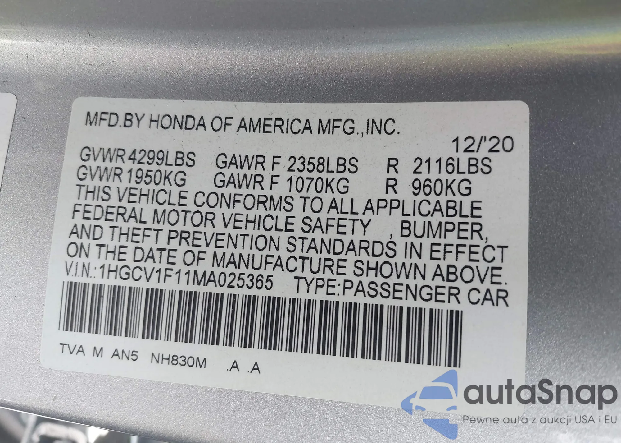 LOT: 42883238 VIN: 1HGCV1F11MA025365