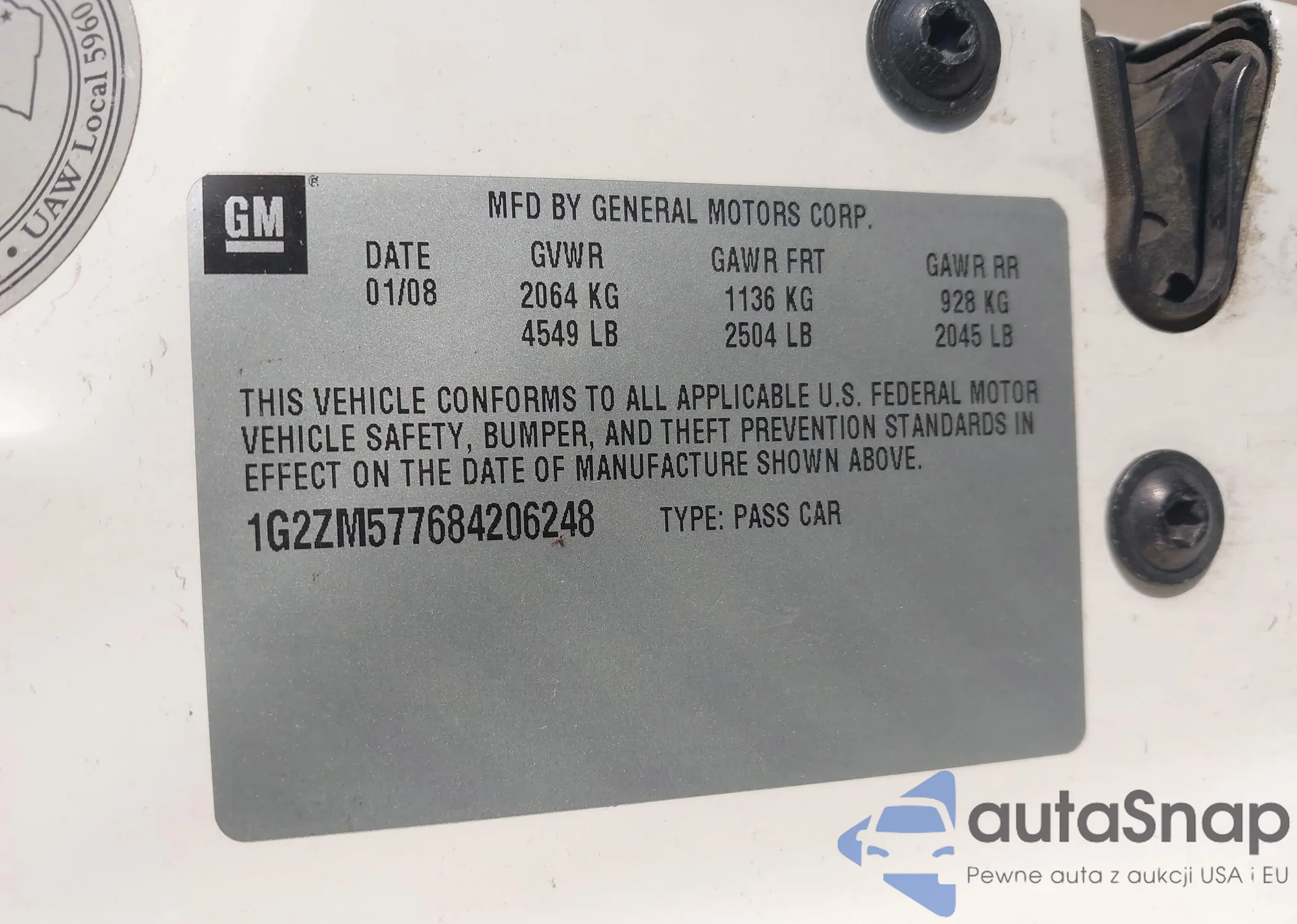 LOT: 43633523 VIN: 1G2ZM577684206248