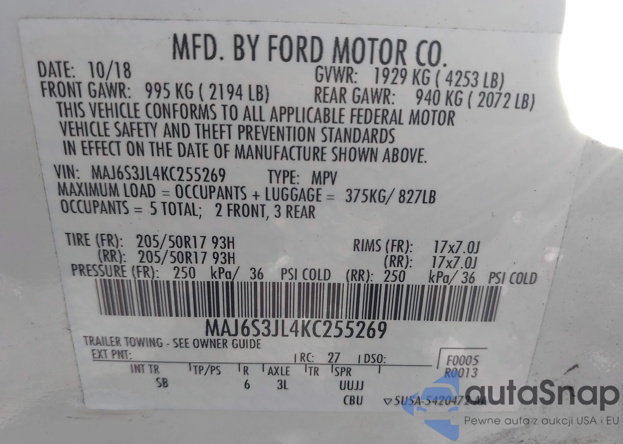 • VIN MAJ6S3JL4KC255269