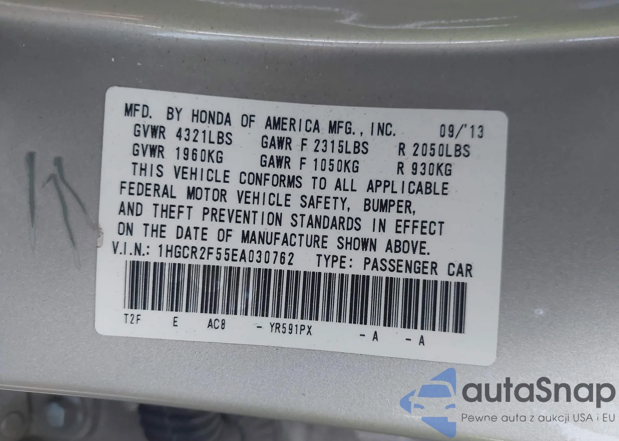 LOT: 43586251 VIN: 1HGCP2F69CA197346