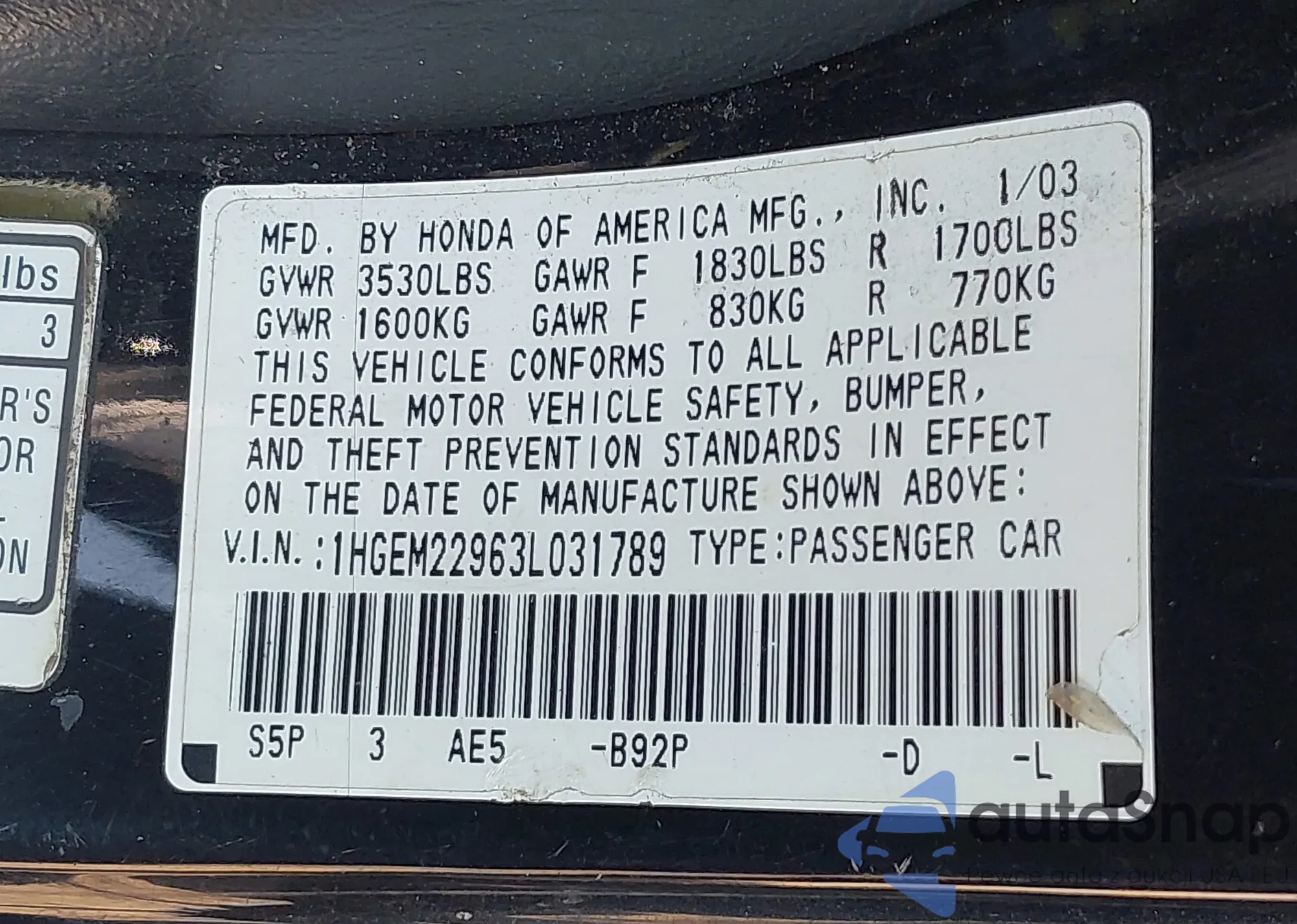 • VIN 1HGCY1F32RA086336
