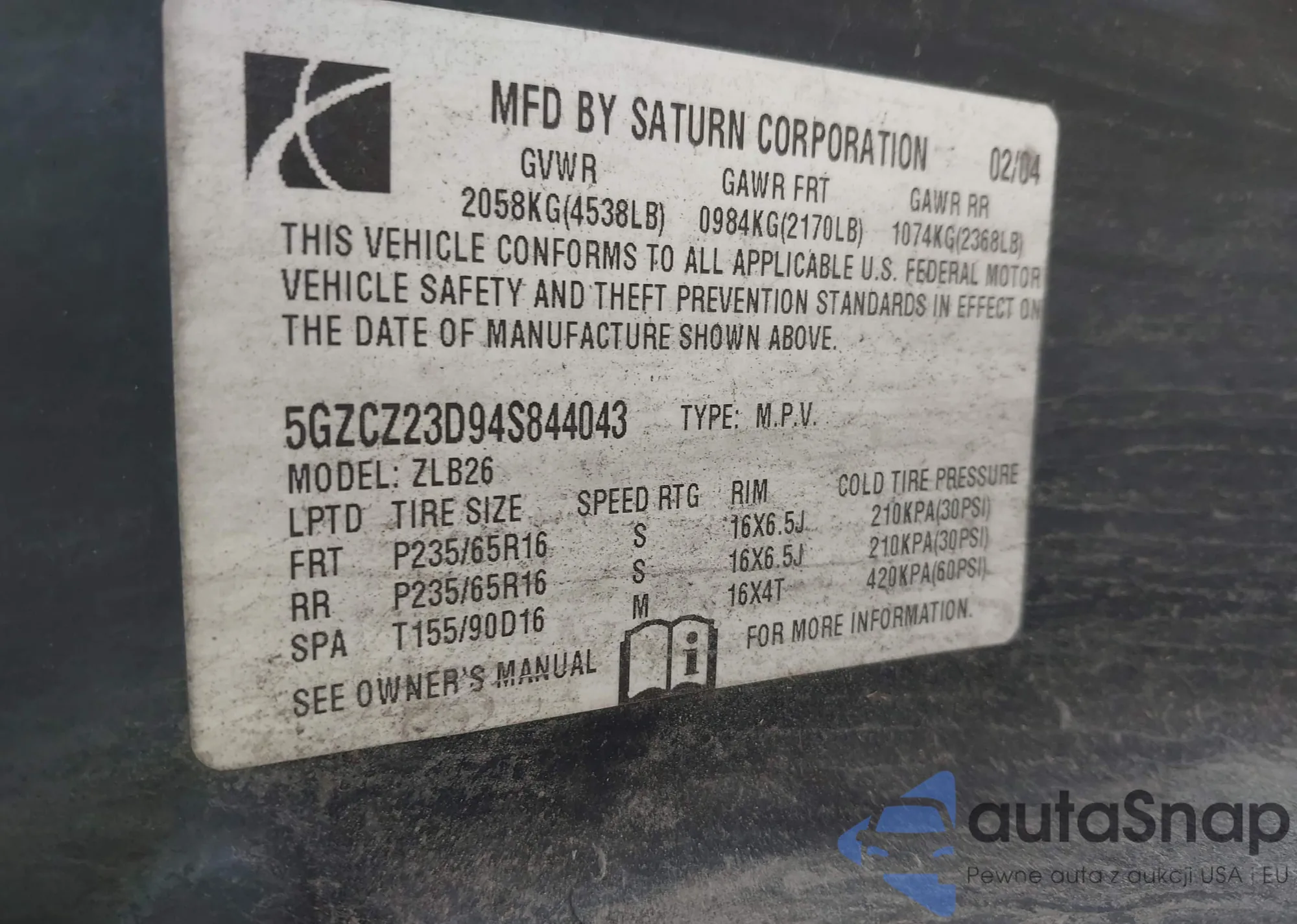 LOT: 43702317 VIN: 5GZCZ23D94S844043