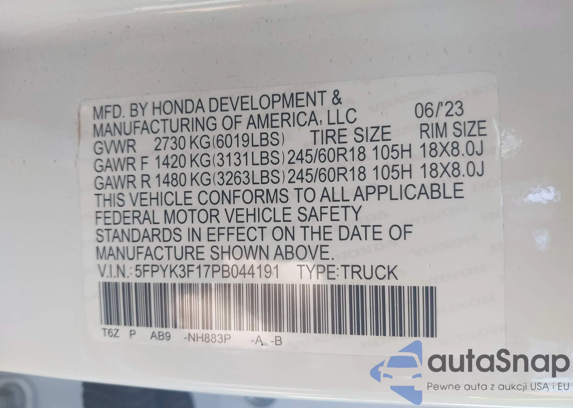 • VIN 5FPYK3F17PB044191