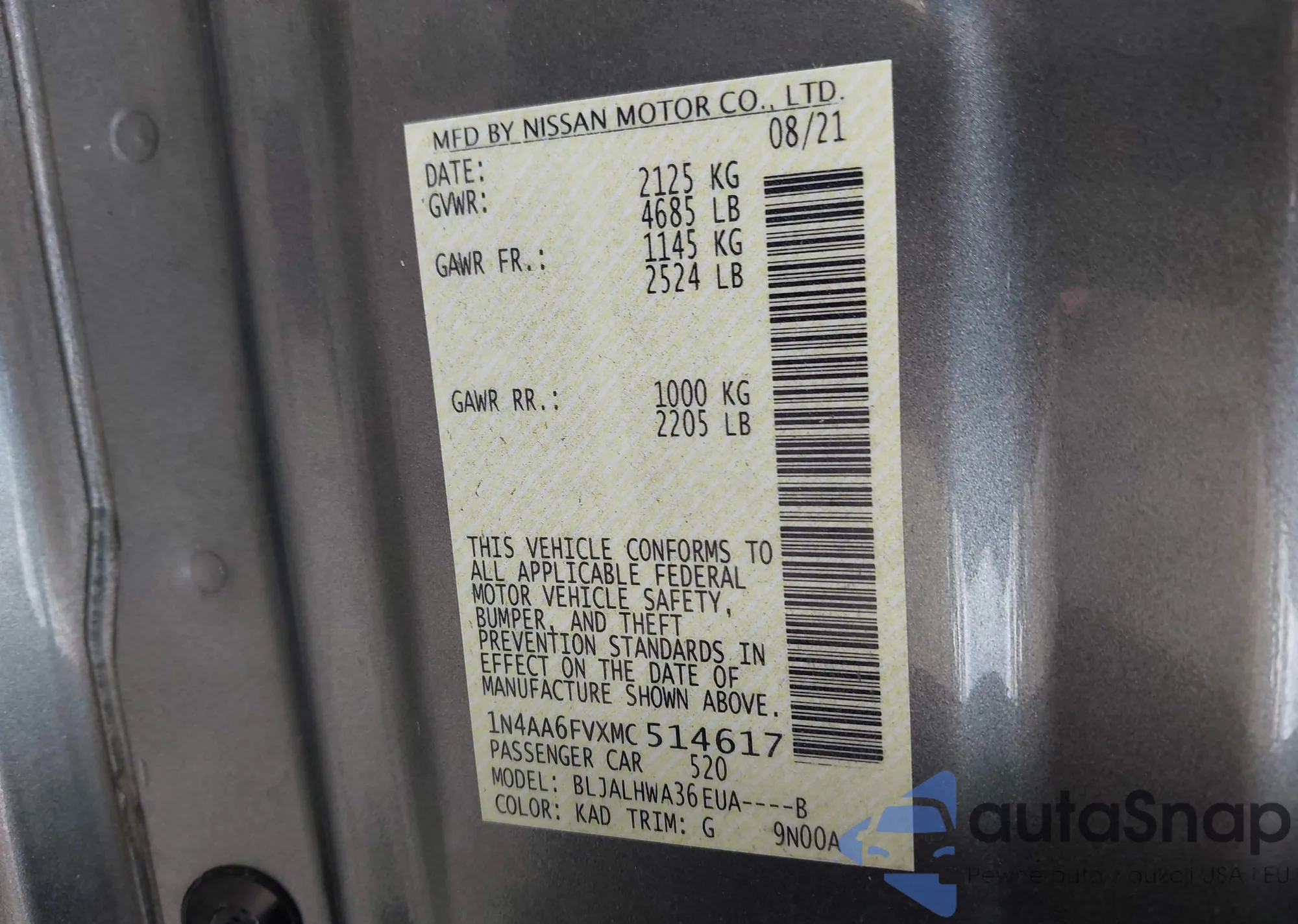 • VIN 1N4AA6FVXMC514617