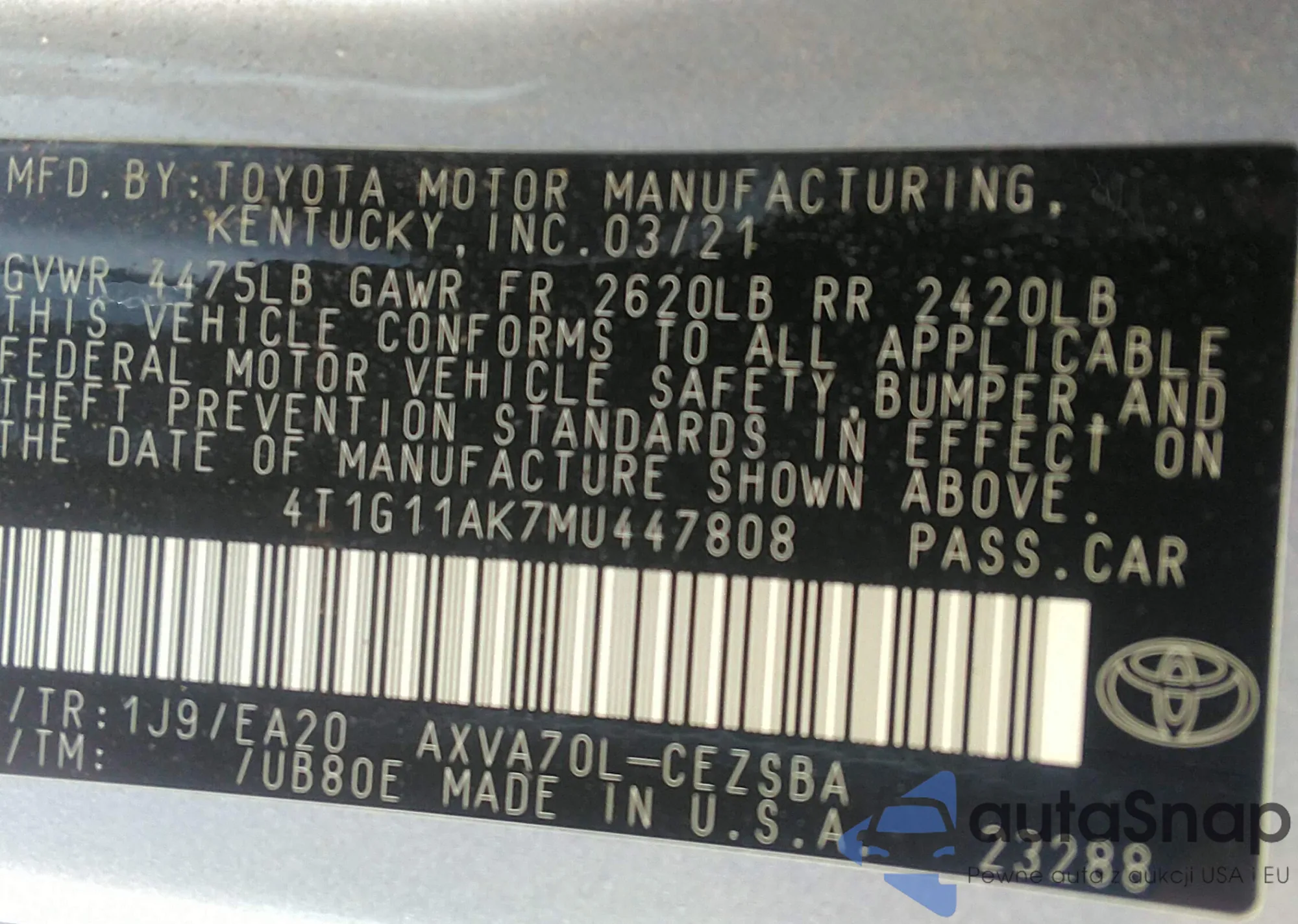 LOT: 43461614 VIN: 4T1G11AK7MU447808