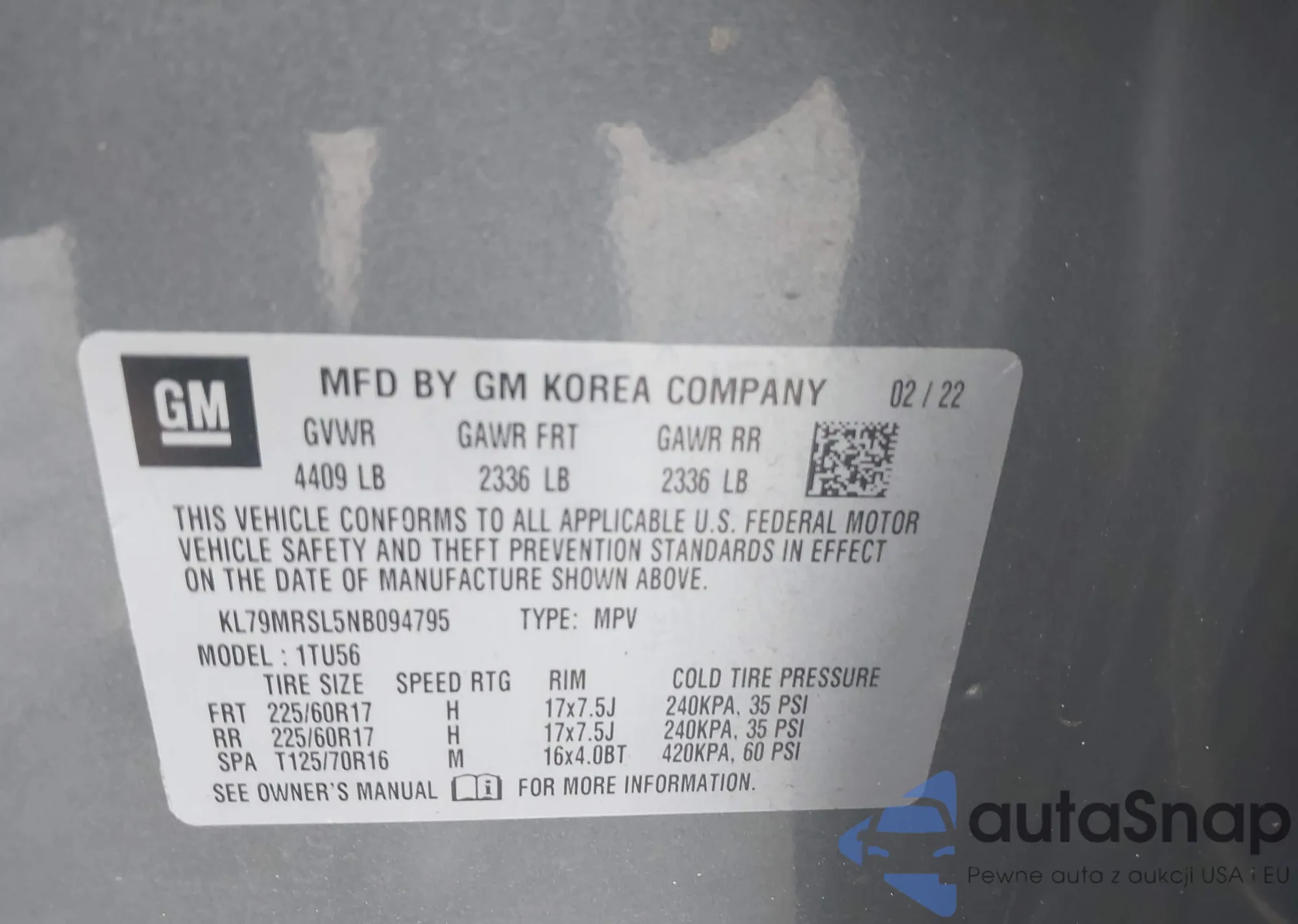 • VIN KL79MRSL5NB094795