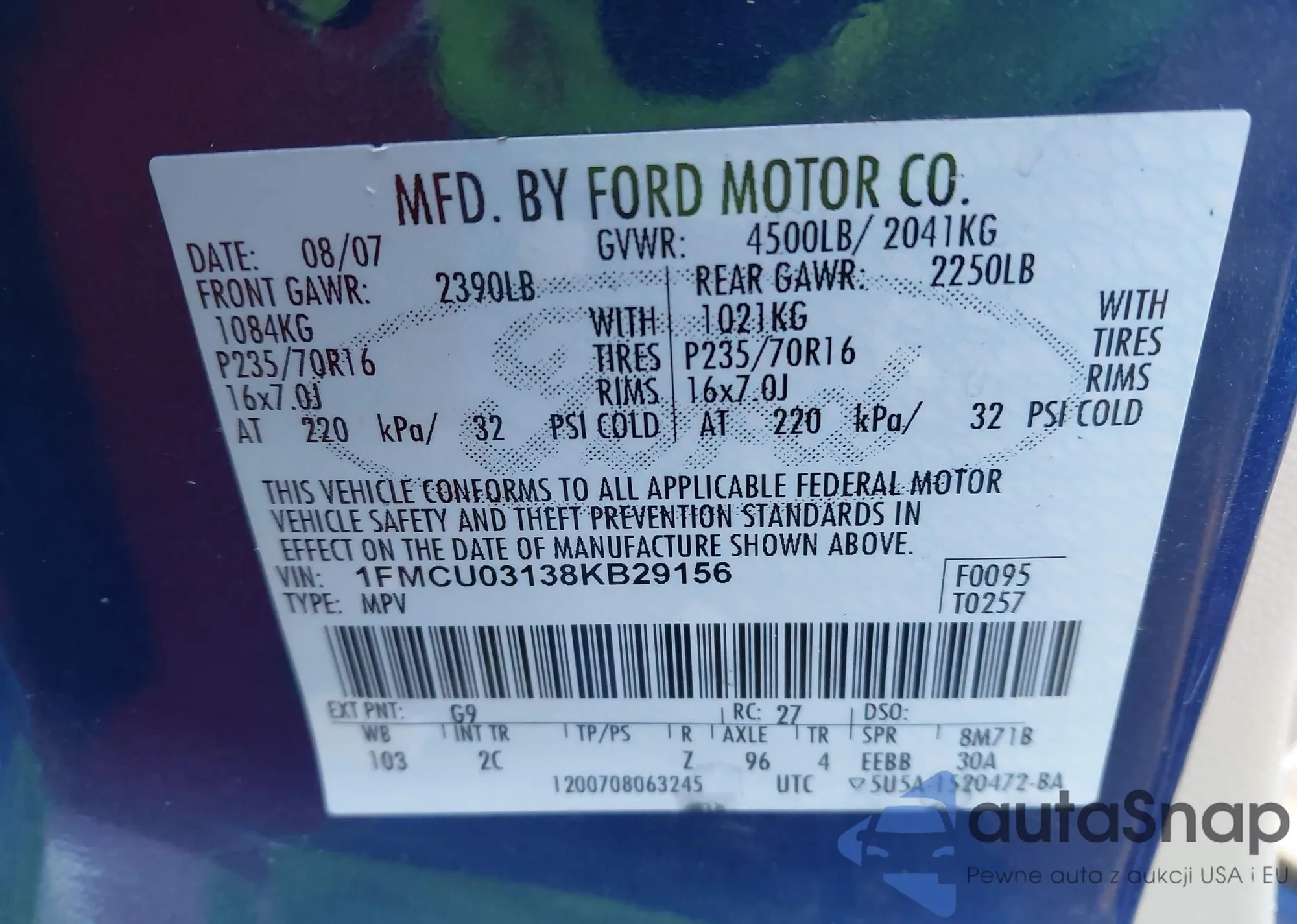 LOT: 43674368 VIN: 1FMCU03138KB29156