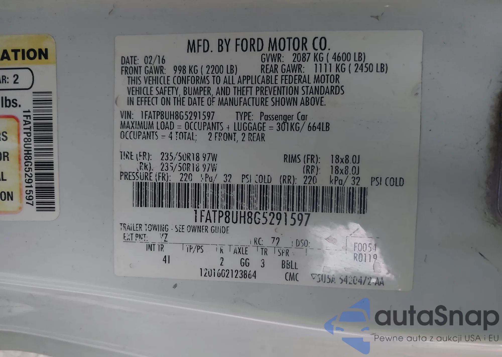 LOT: 43388116 VIN: 1FATP8UH8G5291597