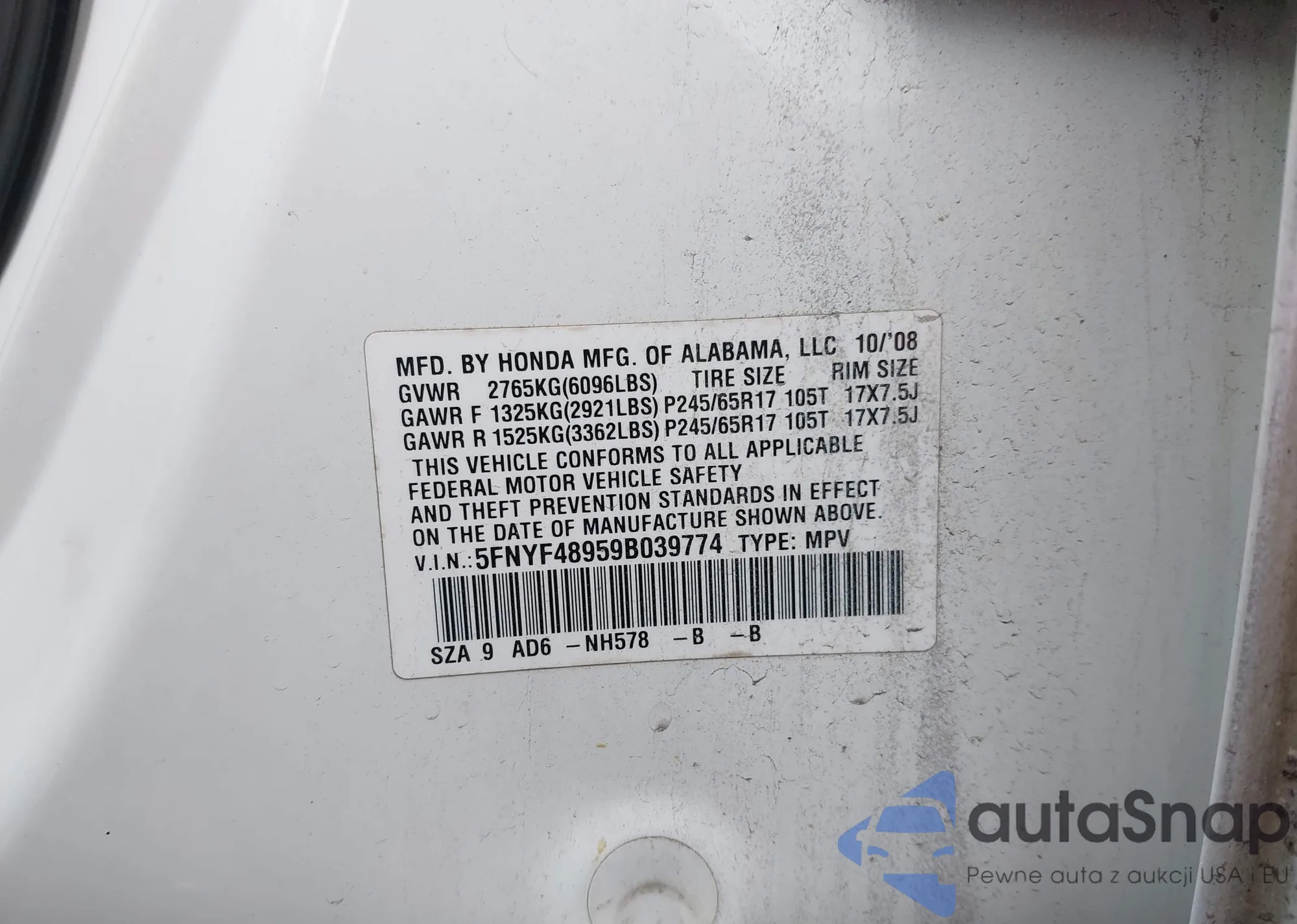 • VIN 5J6RE3H30AL011857