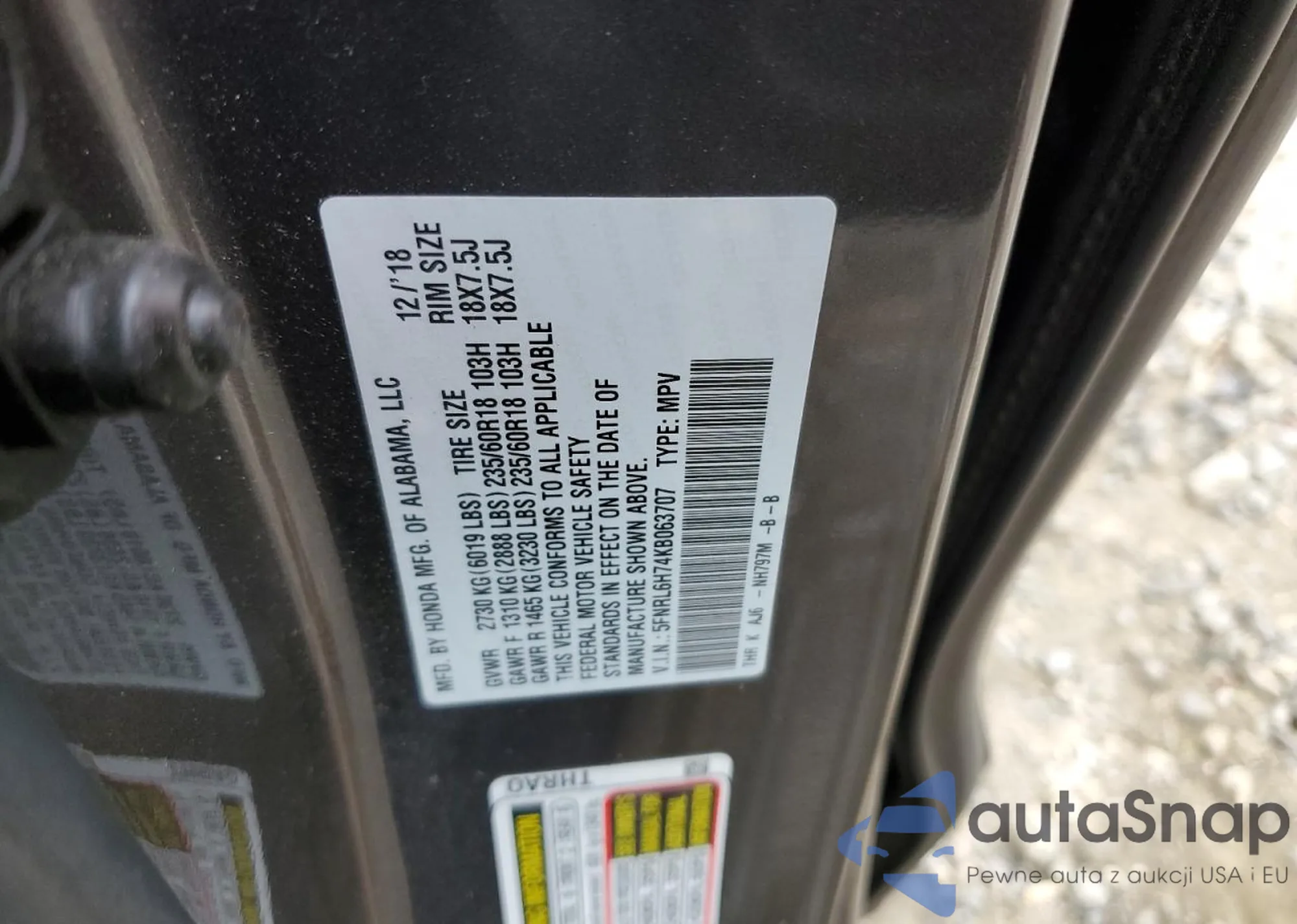 • VIN 5FNRL6H74KB063707