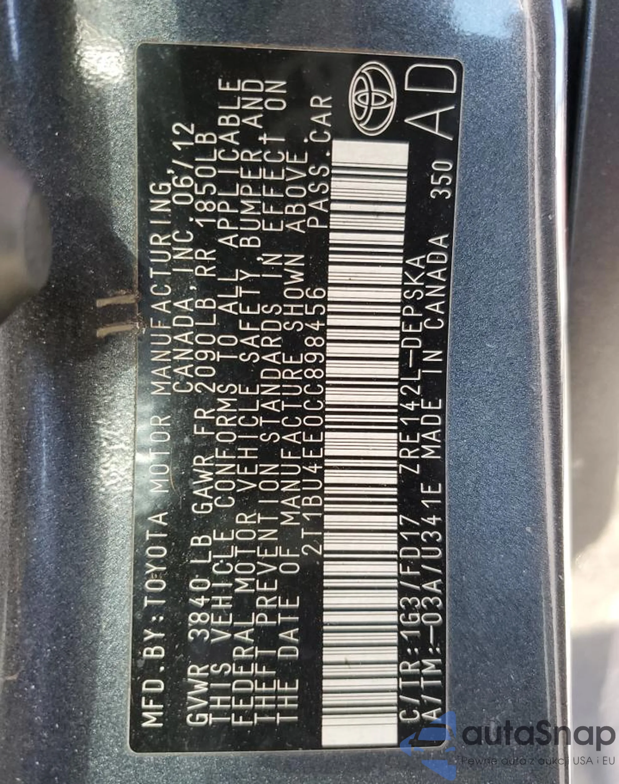 • VIN 2T1BU4EE0CC898456