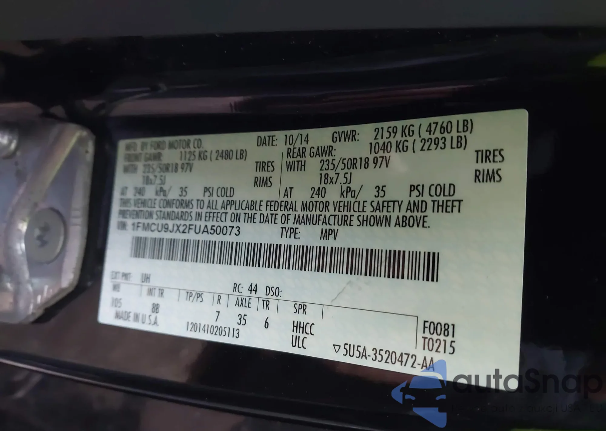 • VIN 1FMCU9JX2FUA50073
